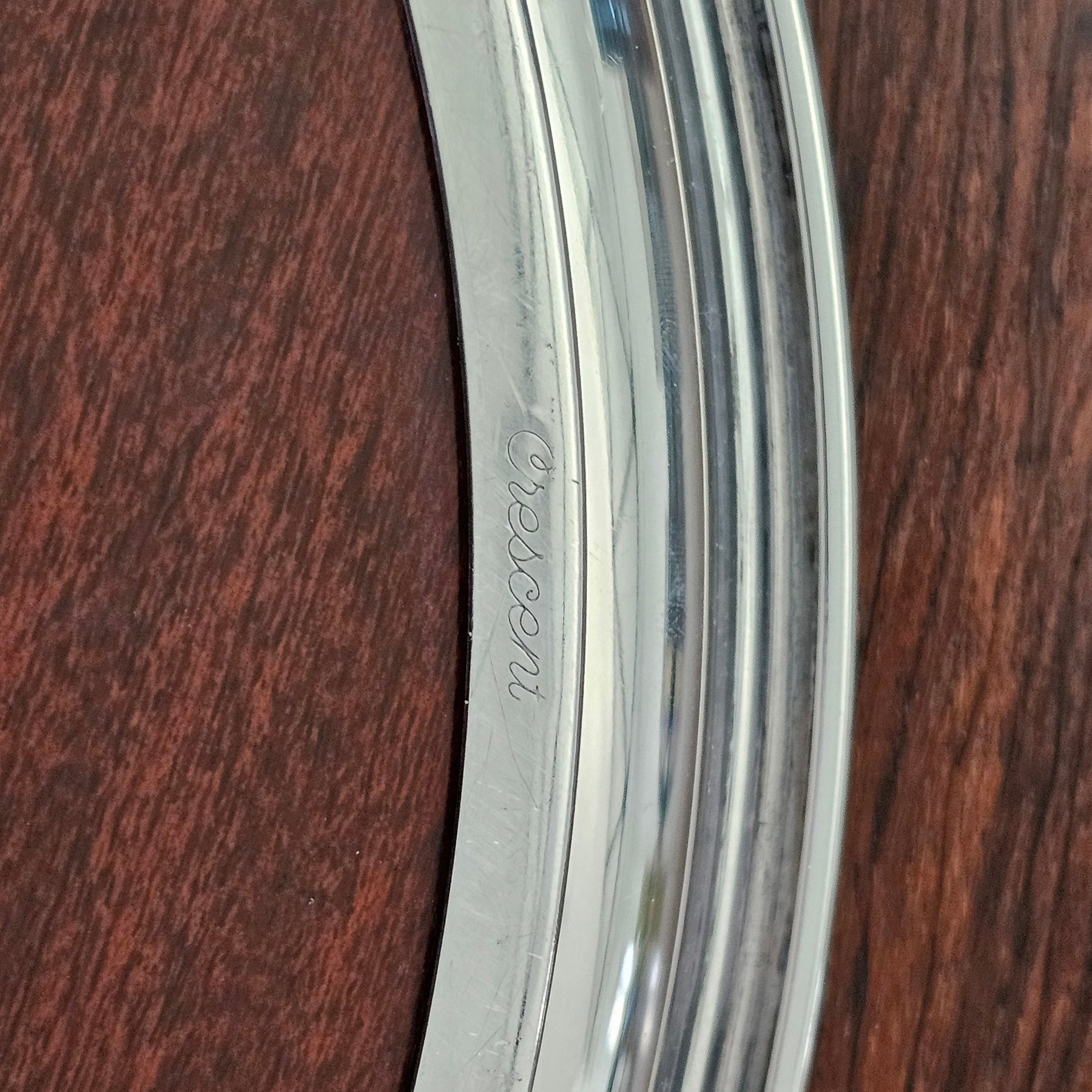 Capture the vintage beauty and elegance of MCM with this Crescent Silver Plated Tray. Measuring approximately 14.25" in diameter, this tray boasts a faux wood interior and an engraved 'Crescent' manufacturer's mark on the base.