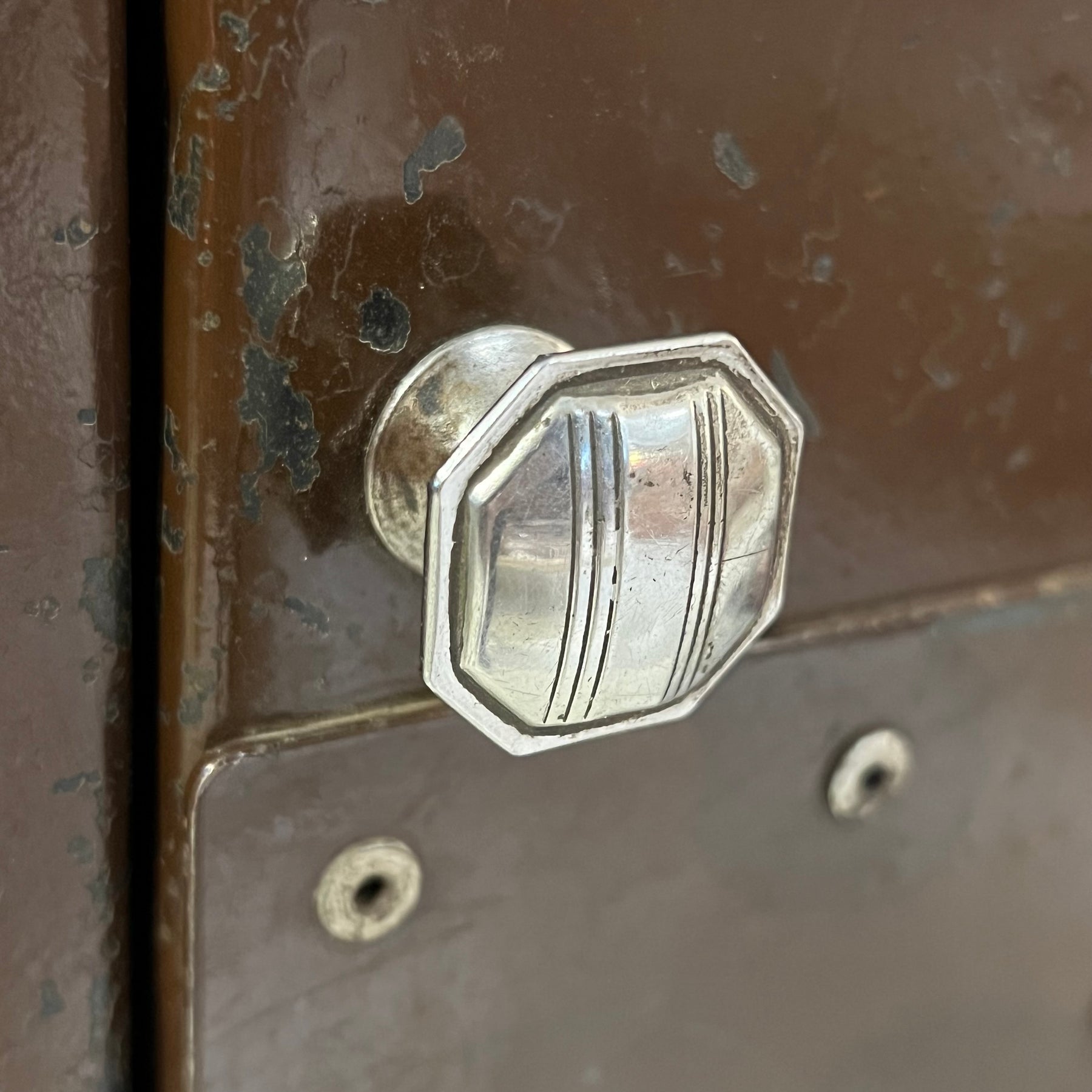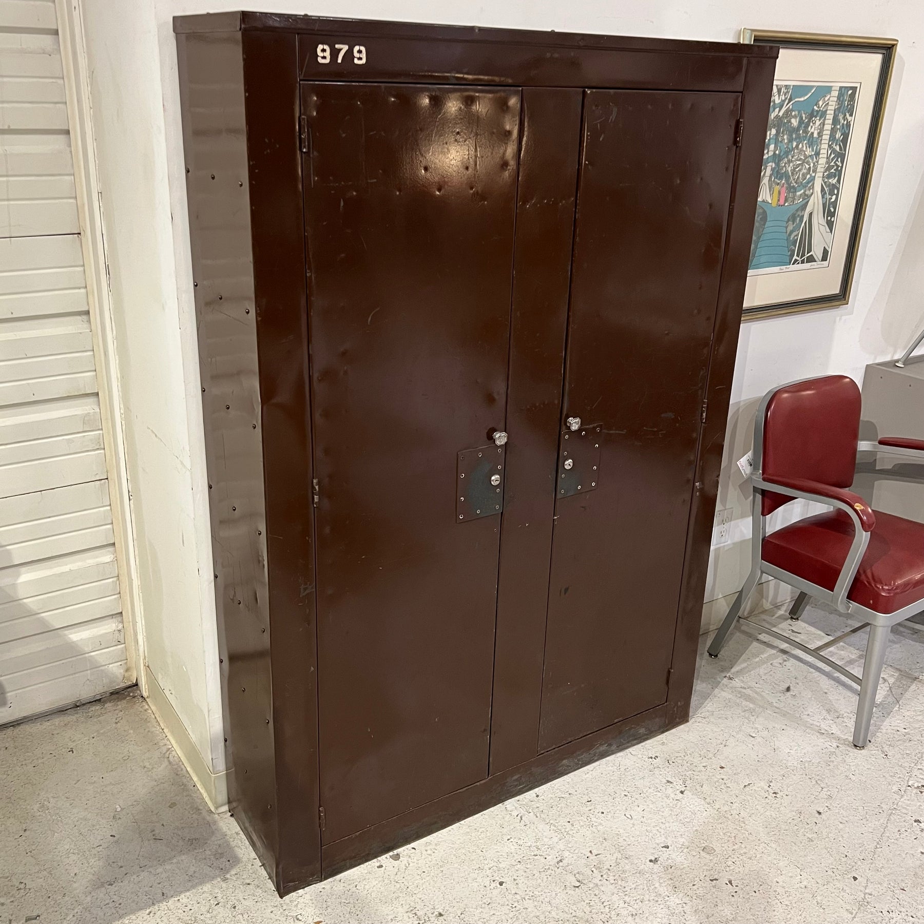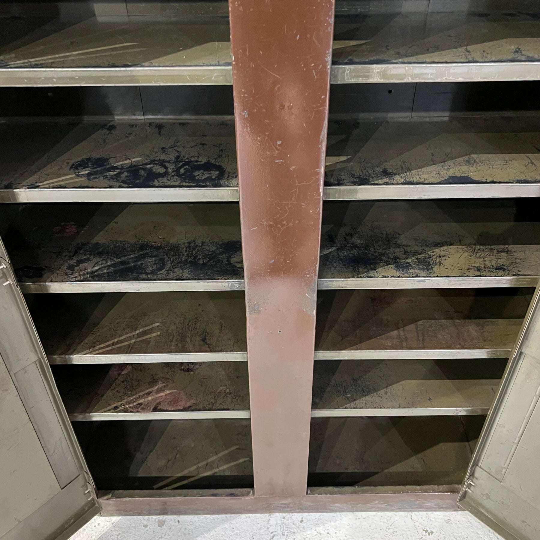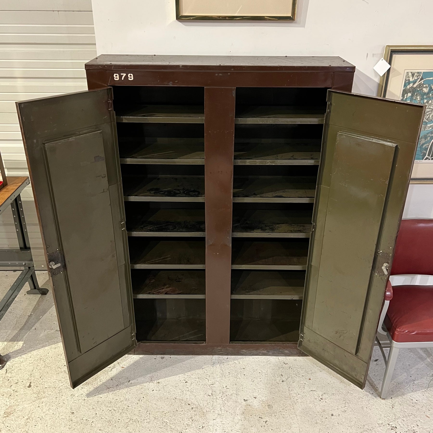 Double-door steel storage cabinet from the 1930s, painted a plummy brown over its original military green color (tho the brown coat of paint is also many decades old, probably from the ‘40s). Nice patina, especially on interior shelves. Shelves are fixed (bolted to the sides and back), though some could be removed if more height were required between them.