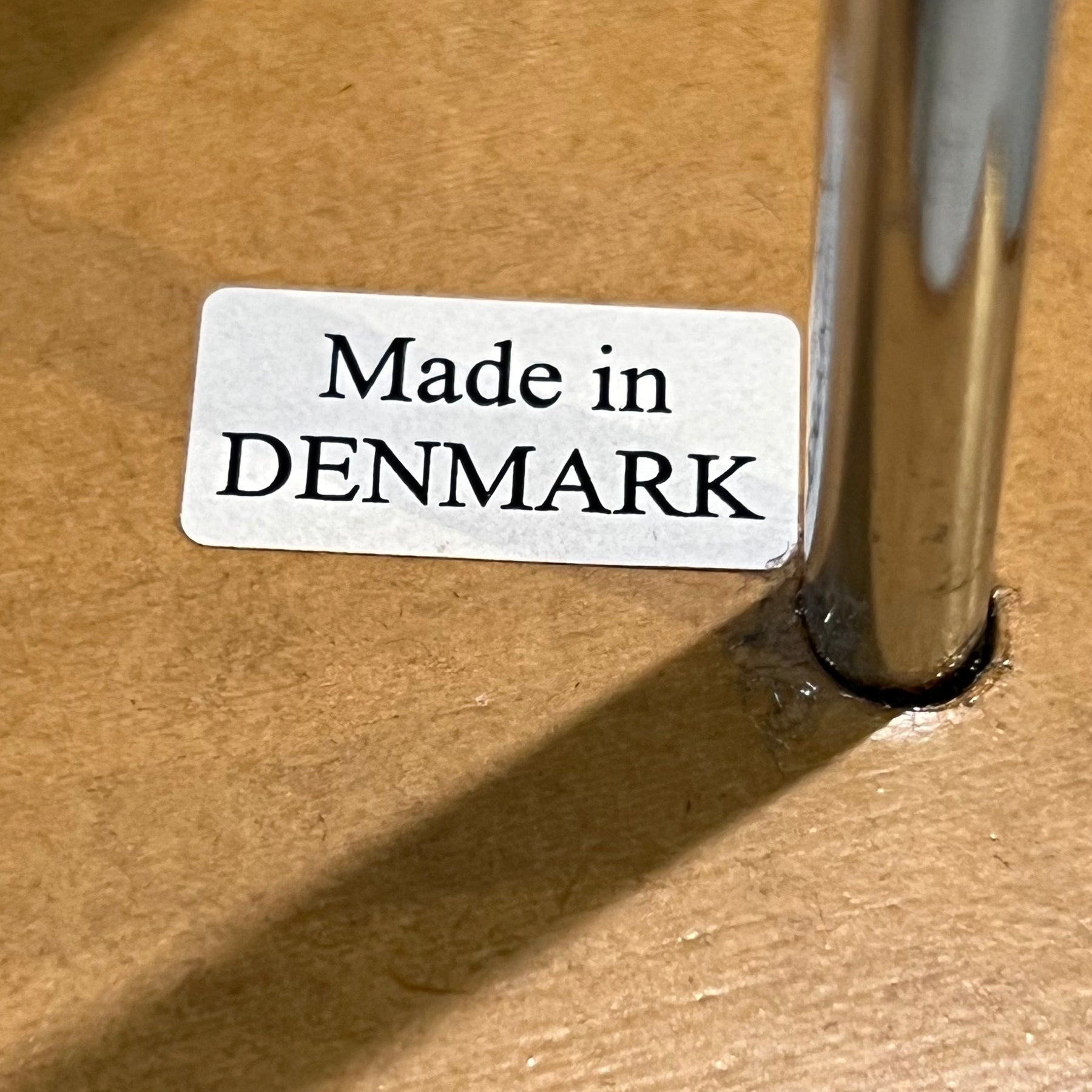 Cherry veneer with a teak finish over a high-density fiberboard substrate. Chrome legs have hard black plastic tips. In excellent condition aside from some very light nicks/scratches common to age and use. Marked “Made in Denmark” underneath.