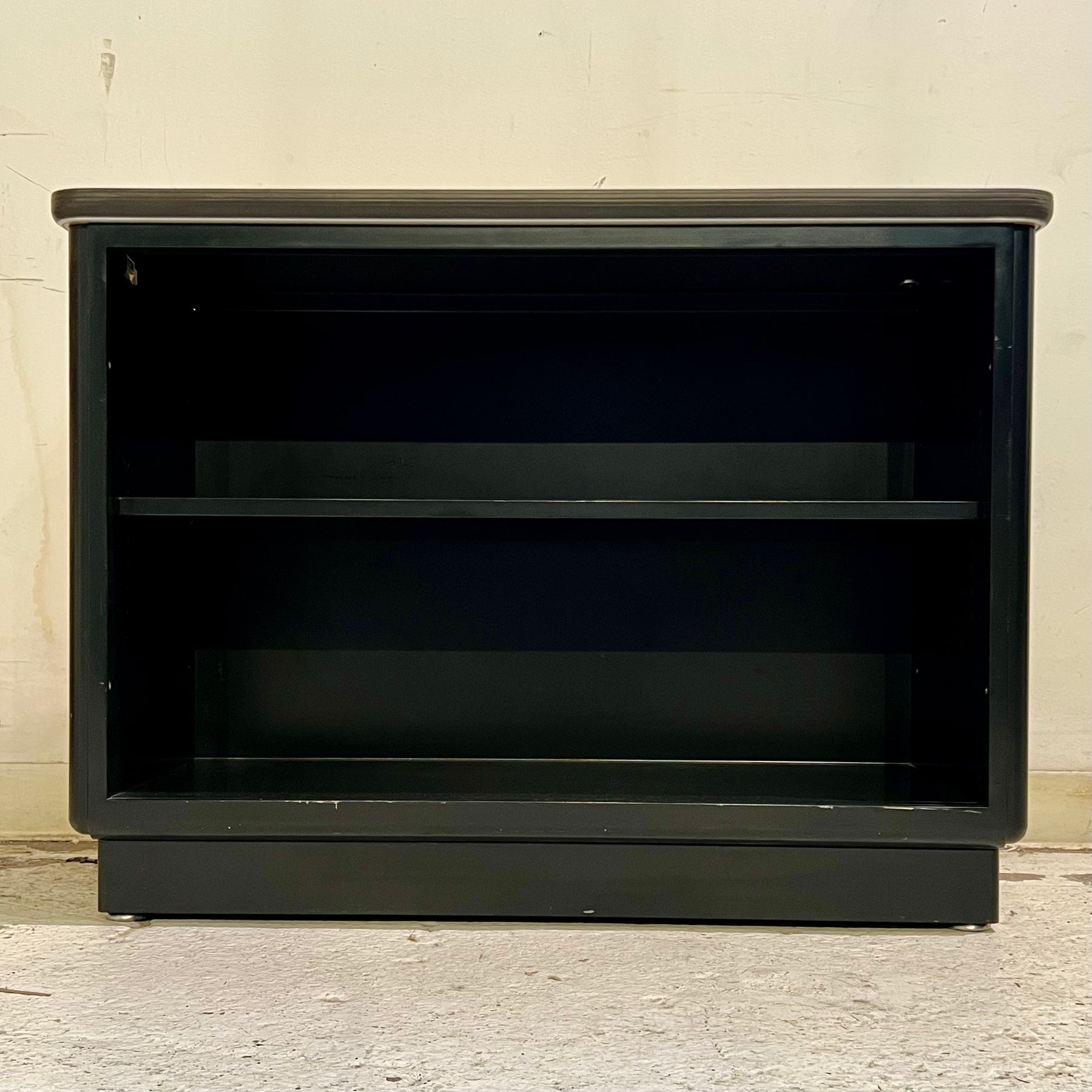 1960s-era All-Steel Equipment short metal bookcase from their classic Aurora Series. Painted black with a woodgrain laminate top with ribbed rubber edging. A few dings and minor wear, but in otherwise excellent condition. Features one adjustable shelf and adjustable glides.