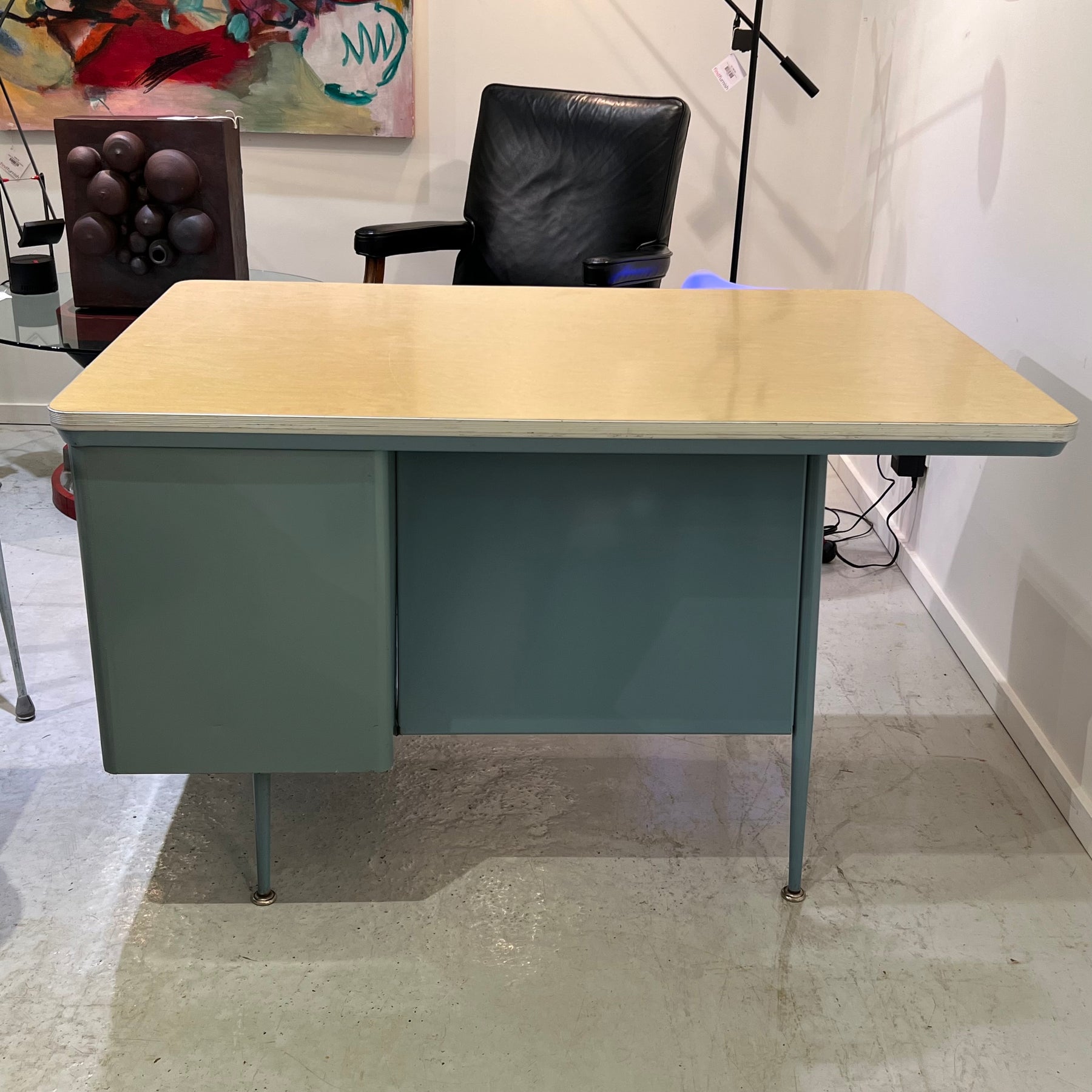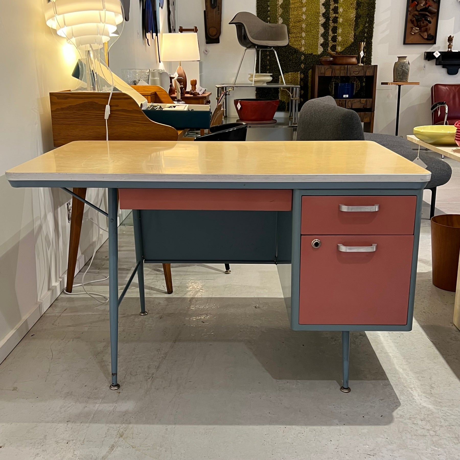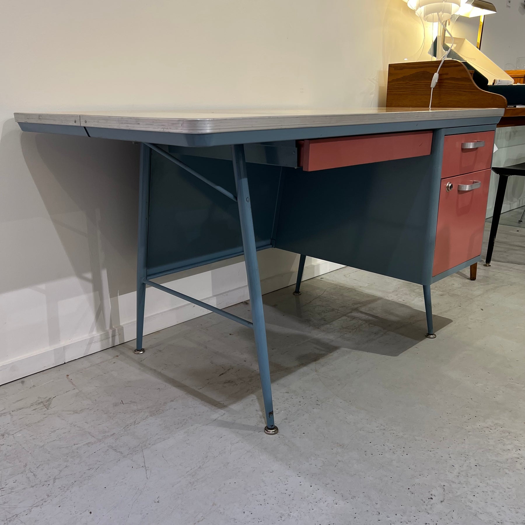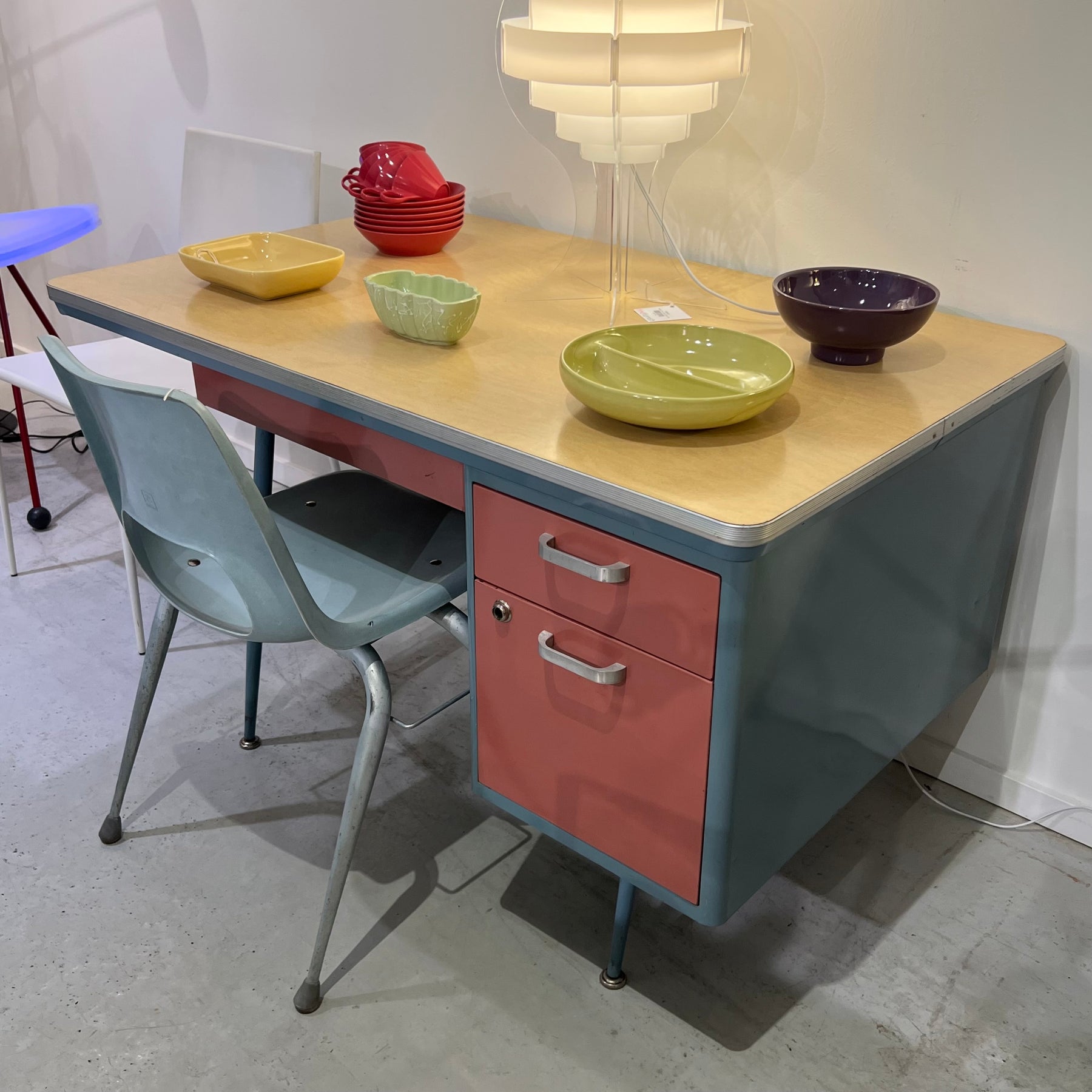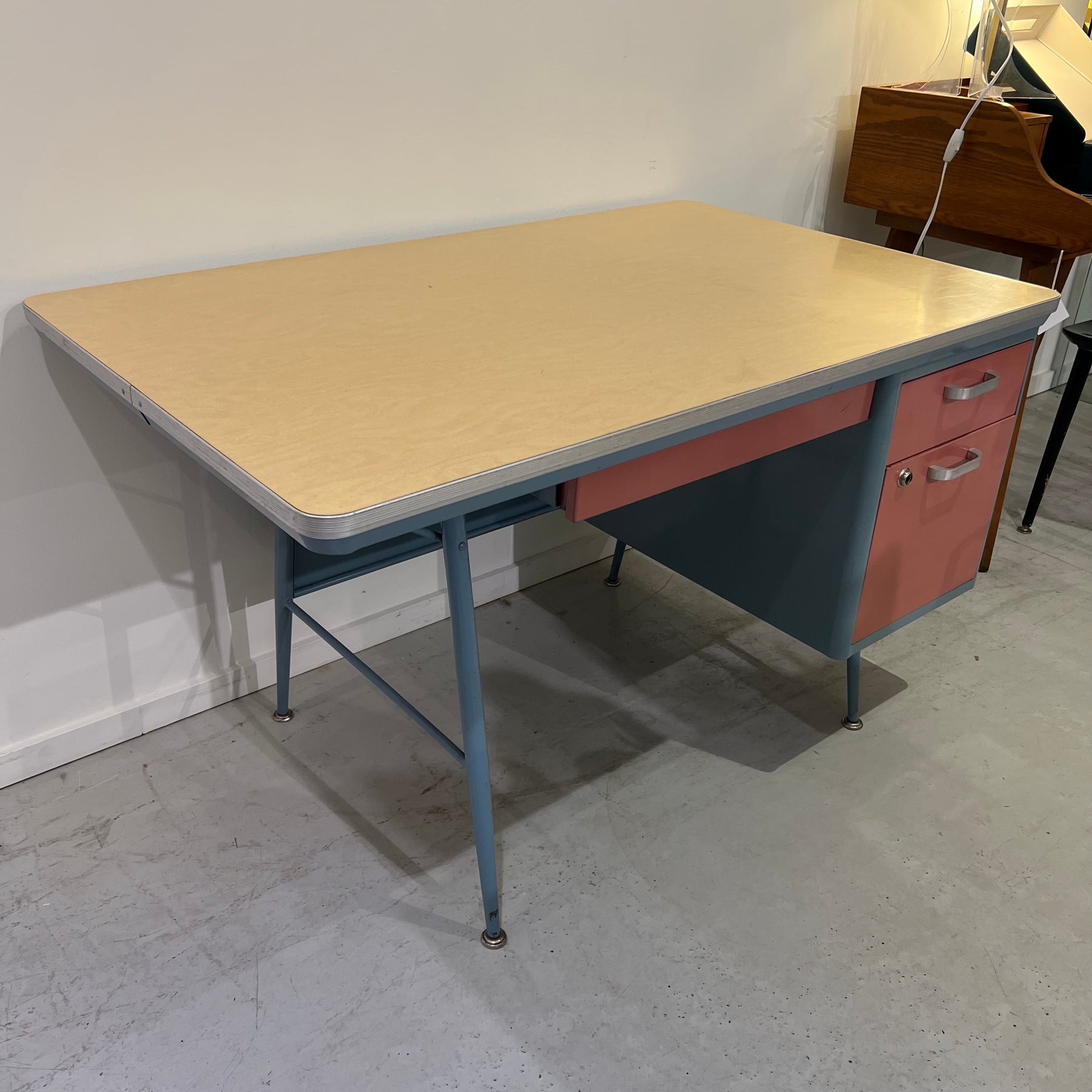 Cute and stylish 1960s-era American Seating Co. pink and blue metal school desk. Top is blonde woodgrain laminate with ribbed aluminum trim. Excellent condition and clean inside and out.