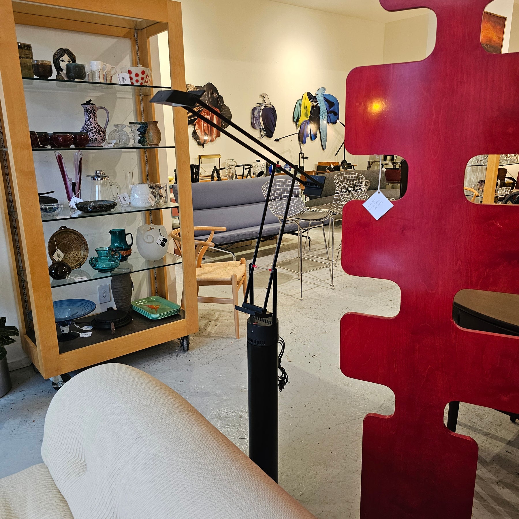 This is the rare floor lamp version of the Tizio, produced in Italy by Artemide. It features the same precision-balanced adjustability and sleek black finish as the desk model, scaled up for dramatic floor placement. A minimalist statement piece that’s equally at home in a modernist living room, studio, or office setting.