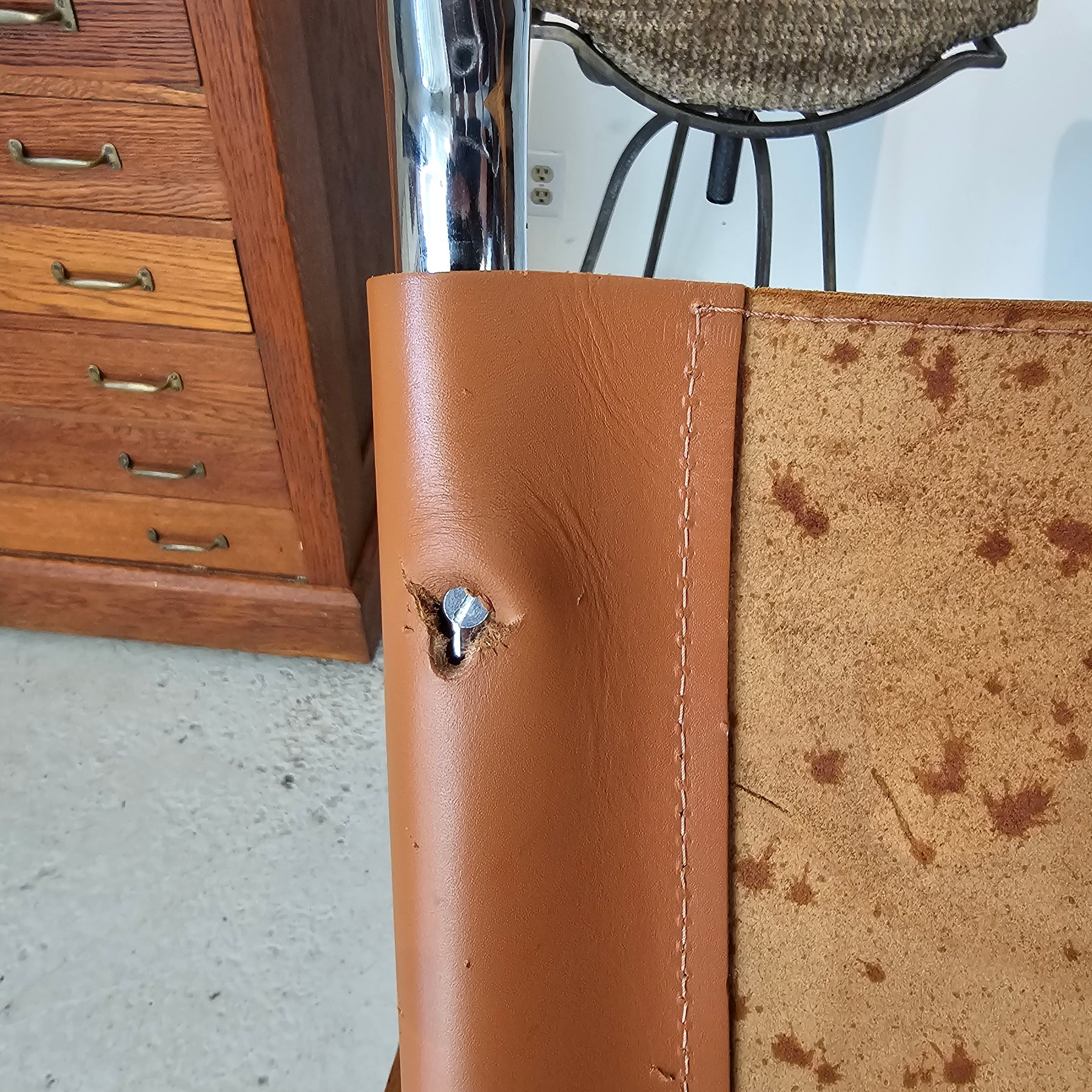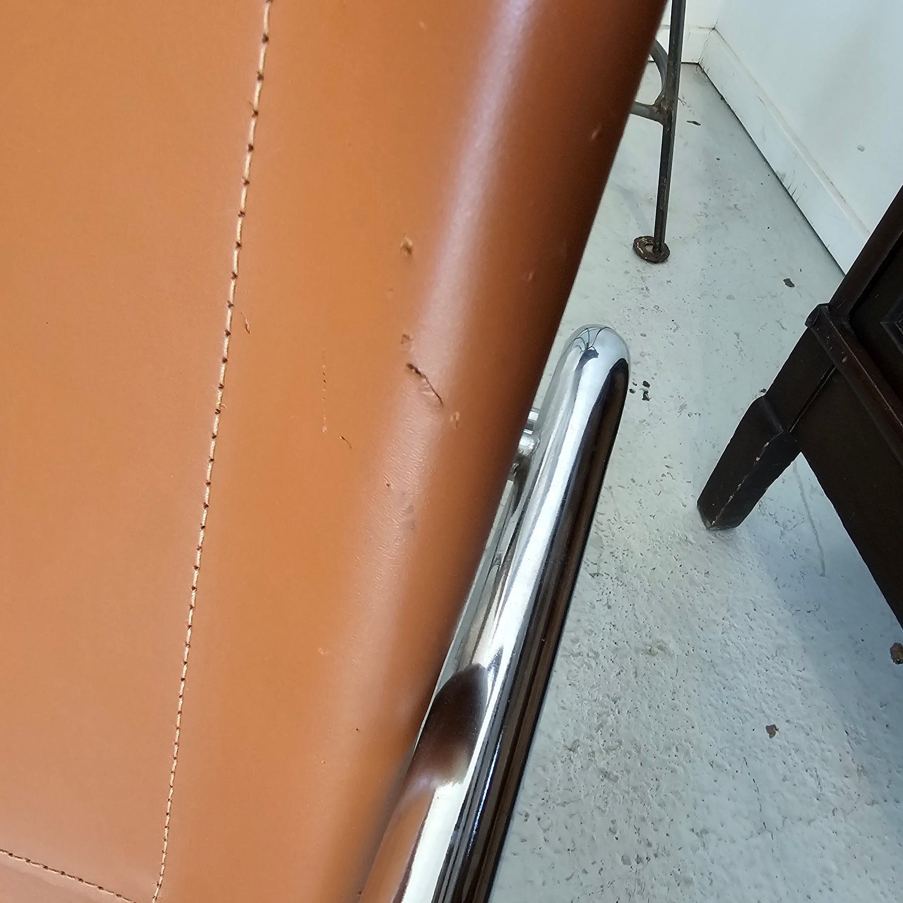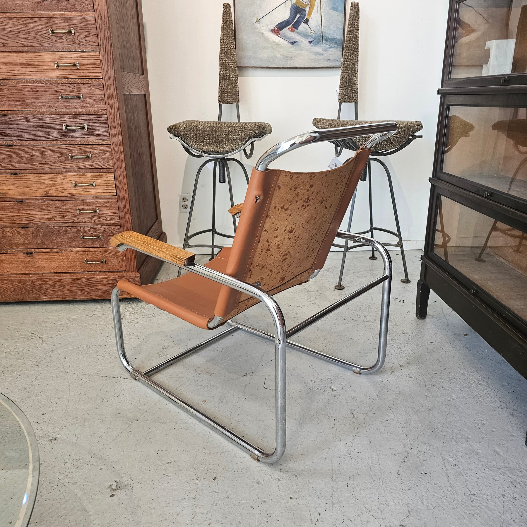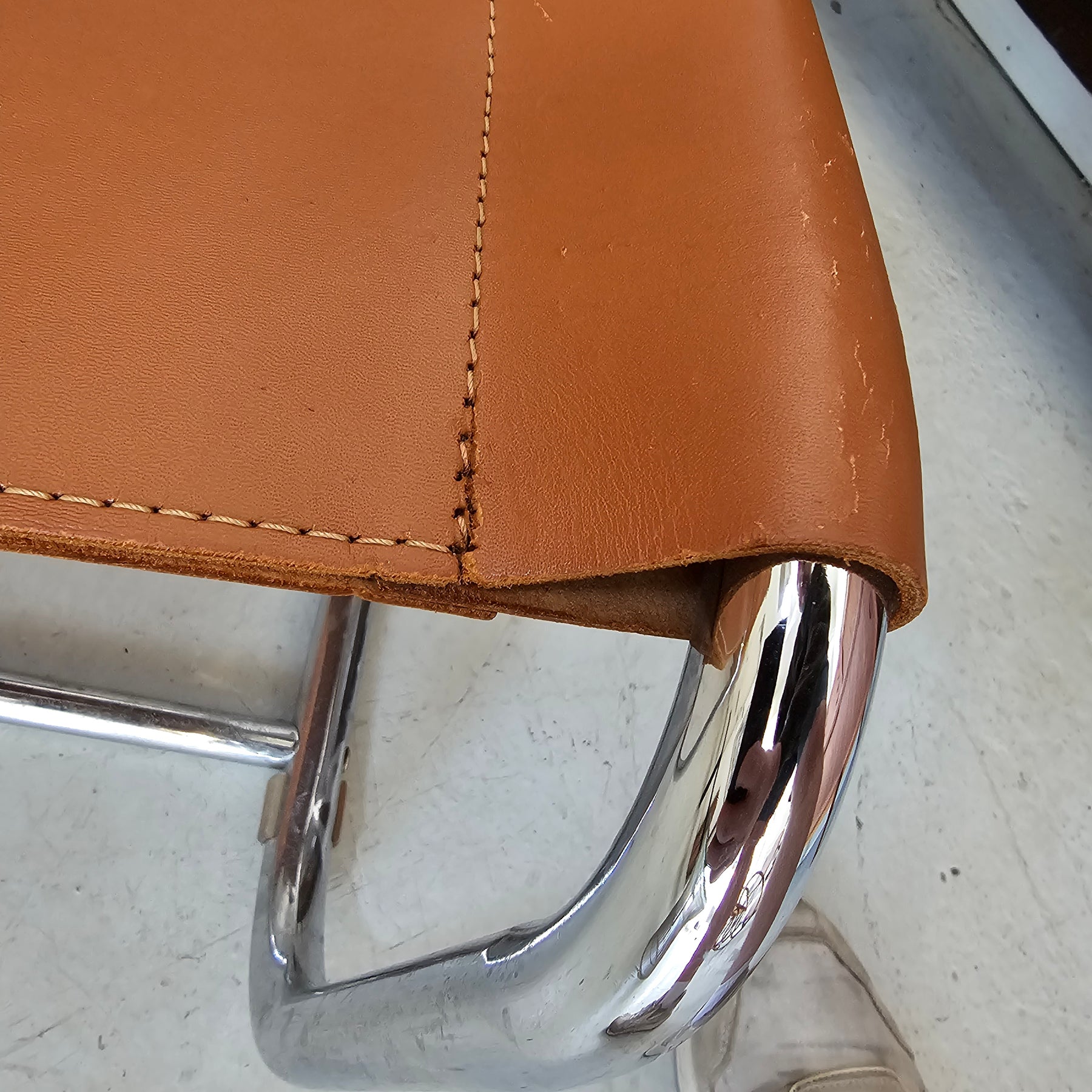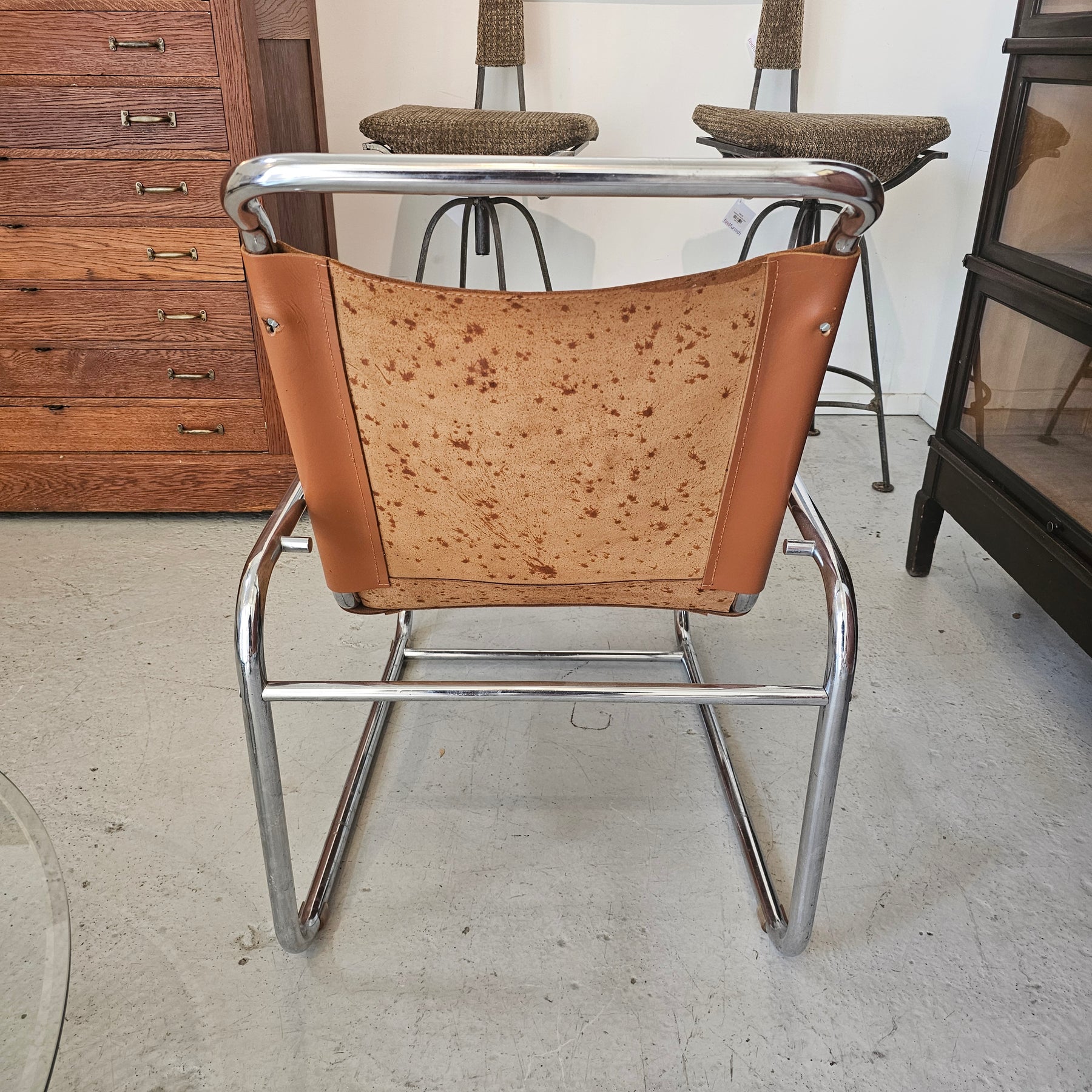 The polished chrome frame floats effortlessly in space, supporting a sling seat and backrest in rich, patinated leather with matching armrests. The chair’s gentle recline and flexible cantilevered base offer a surprisingly relaxing sit, whether in a modernist living room or a collected interior.