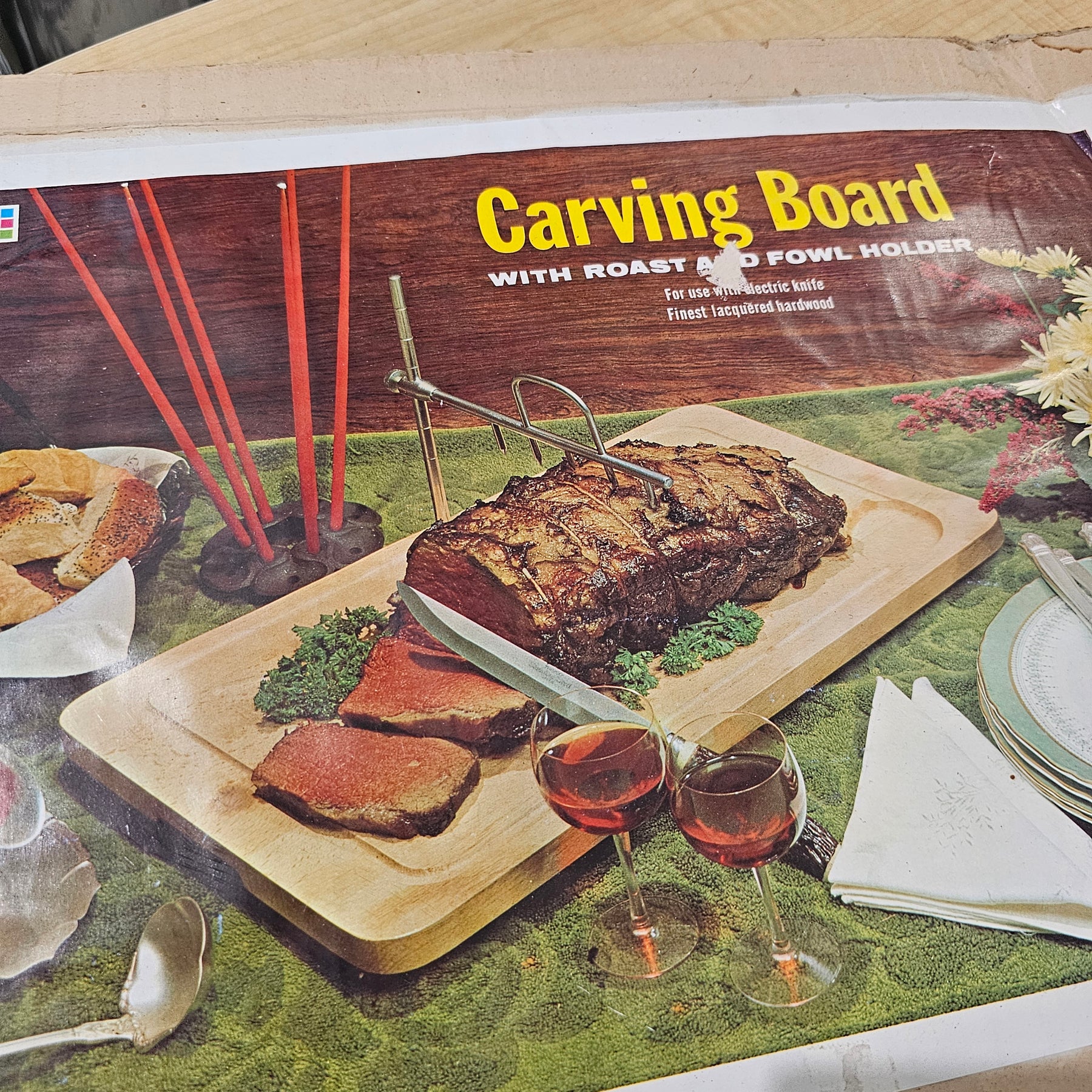 Unique carving board, including a steel roast / fowl holder to make carving easier.