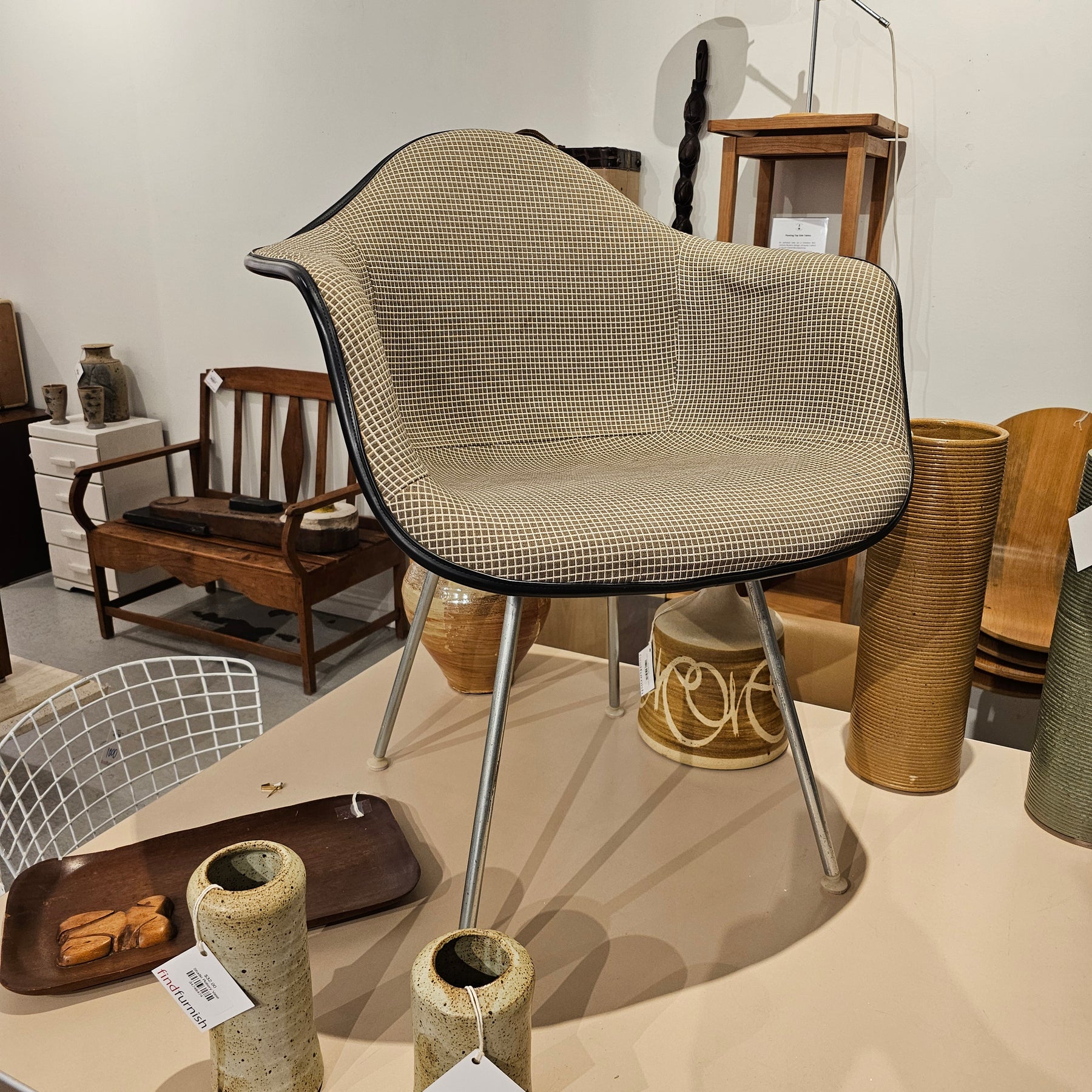 The 2nd Gen Eames Side Chair boasts its original upholstery, which is in fair/good condition. The stylish fiberglass frame may have some noticeable scuffs and marks.