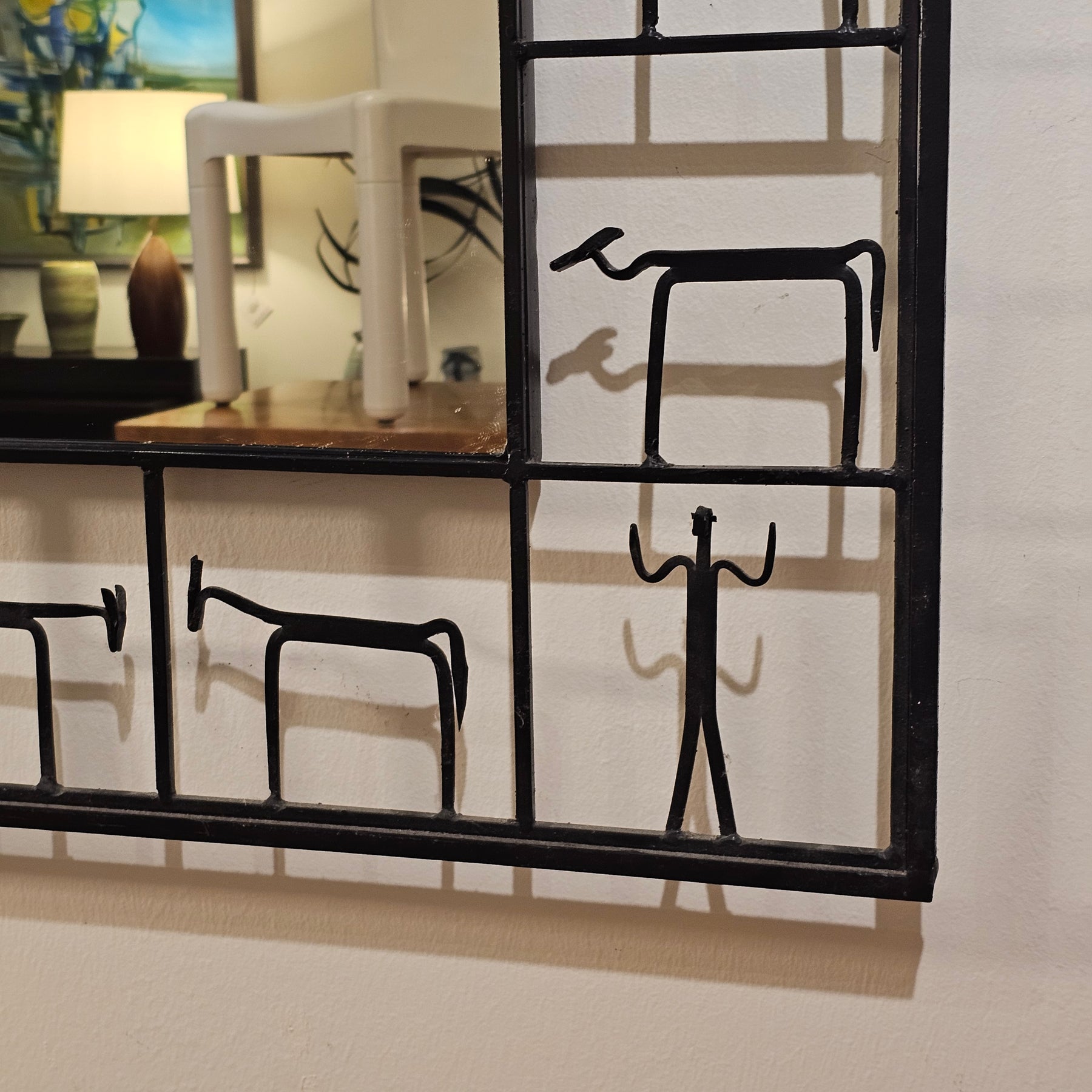 Brutalist iron mirror, with figural motif, styled after Frederic Weinberg.