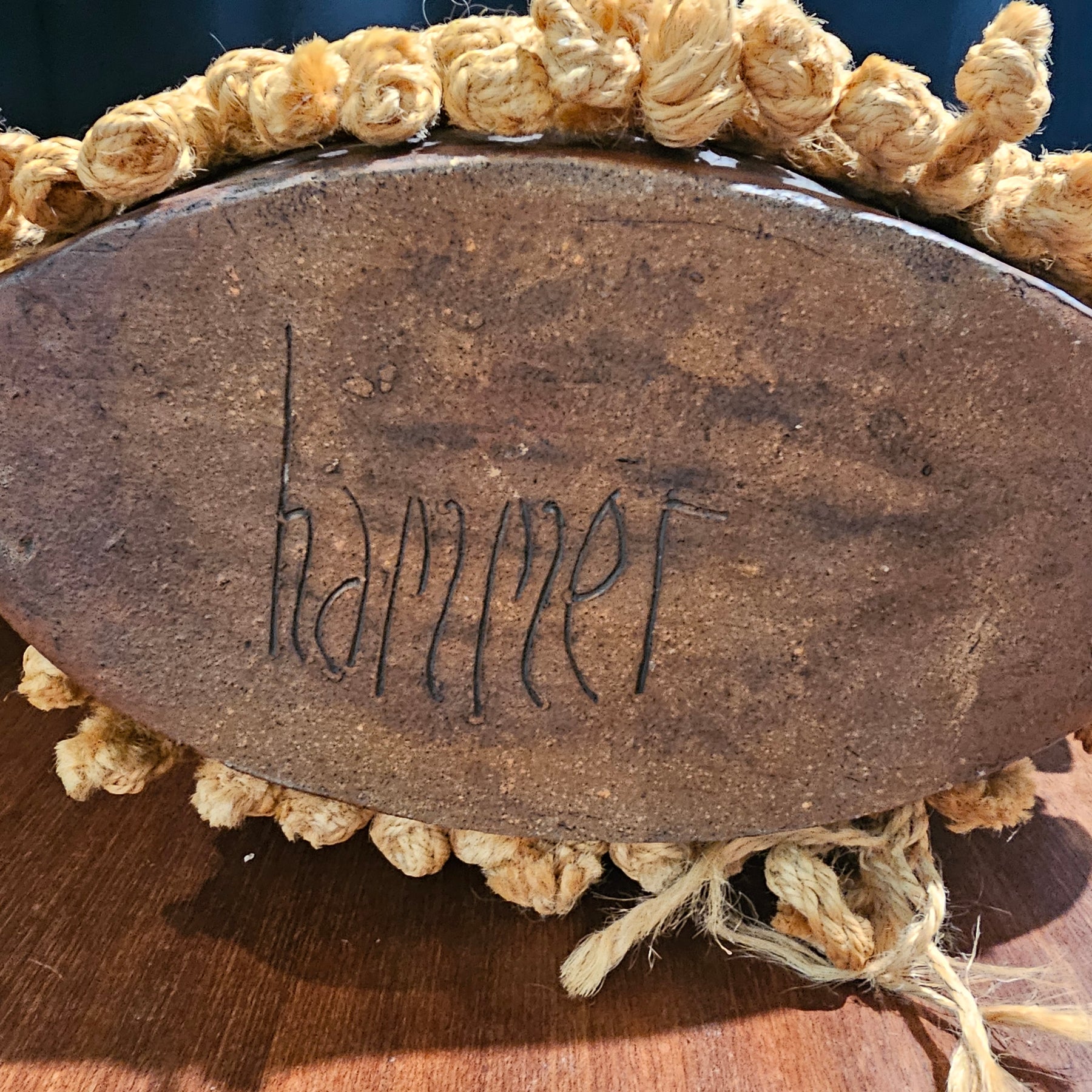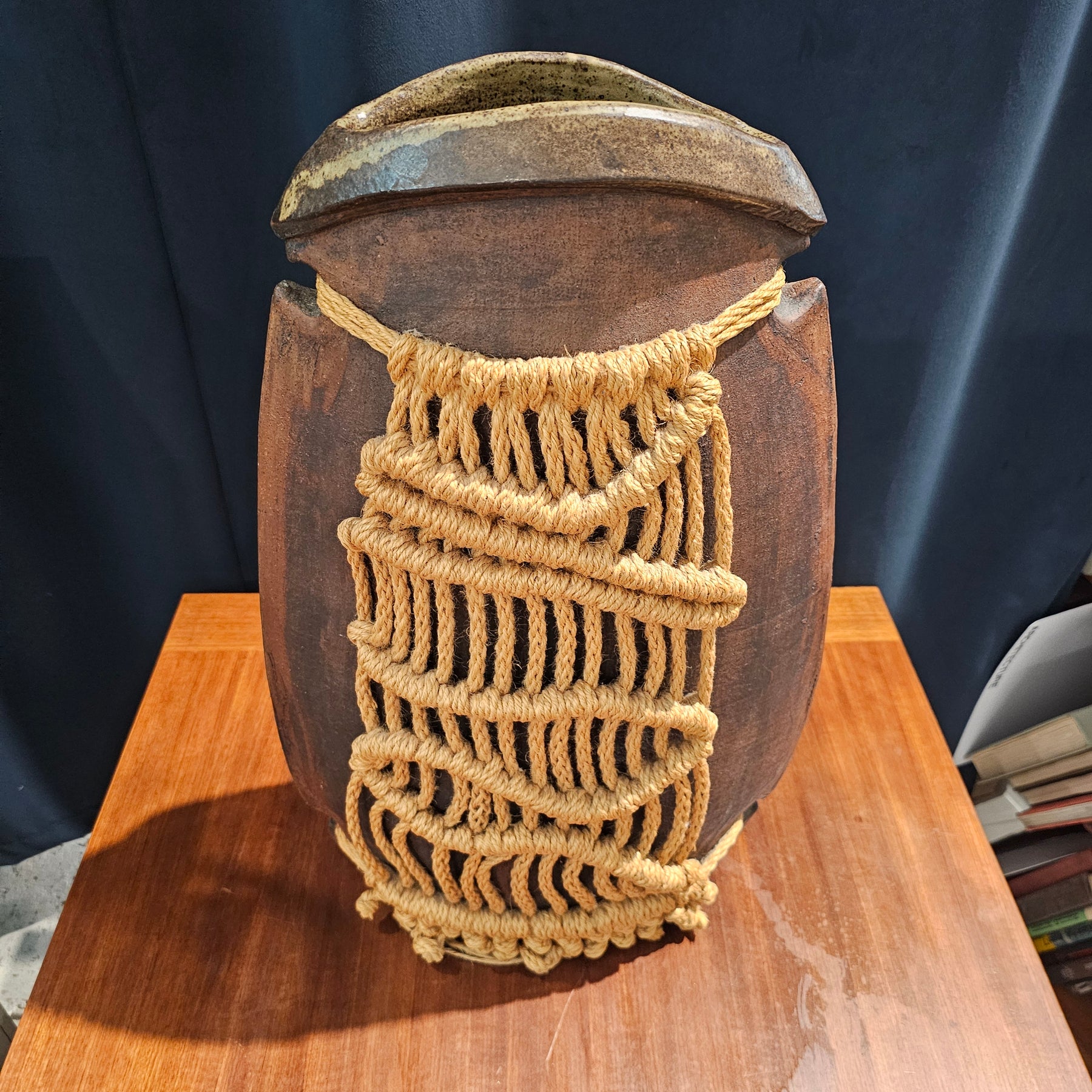 Monumental, signed vase with macrame detail by artist Aleph Lynn Hammer.