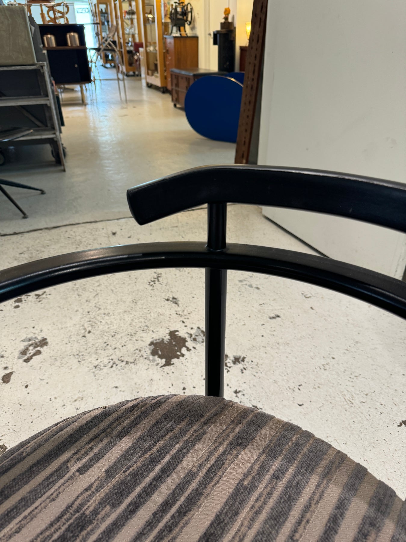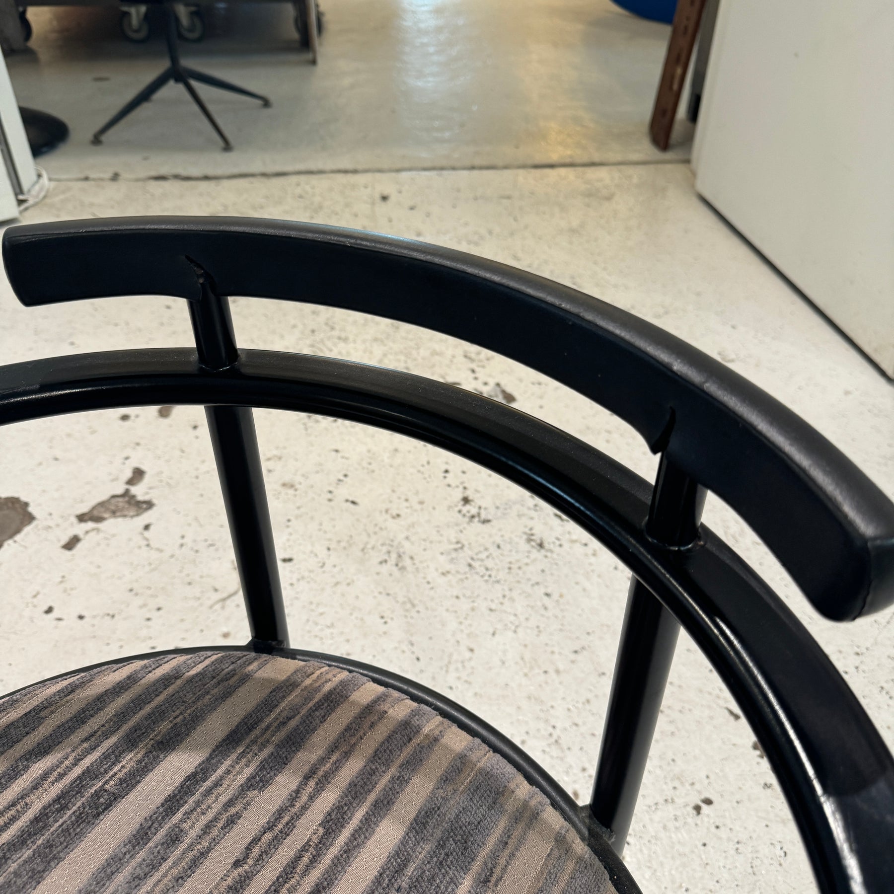 Set of Four Post Modern Lowenstein Dining Chairs. Two of the chairs have signs of wear on the backrests as pictured, as well as some wear to upholstery in spots.