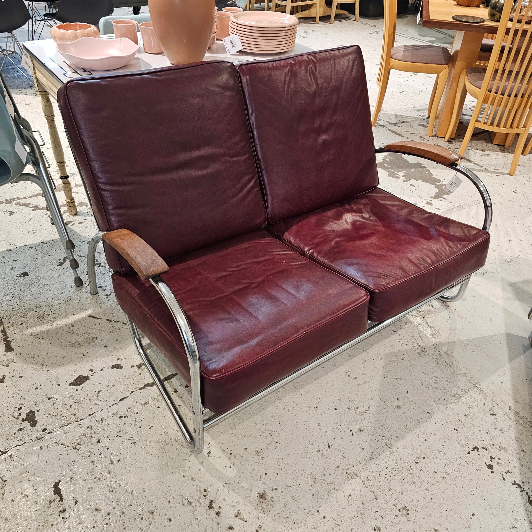 Machine Age Loveseat in the style of K.E.M. Weber. Original maroon vinyl cushions/upholstery are intact with small signs of wear. Piece includes custom covers that can be easily slipped on or off.