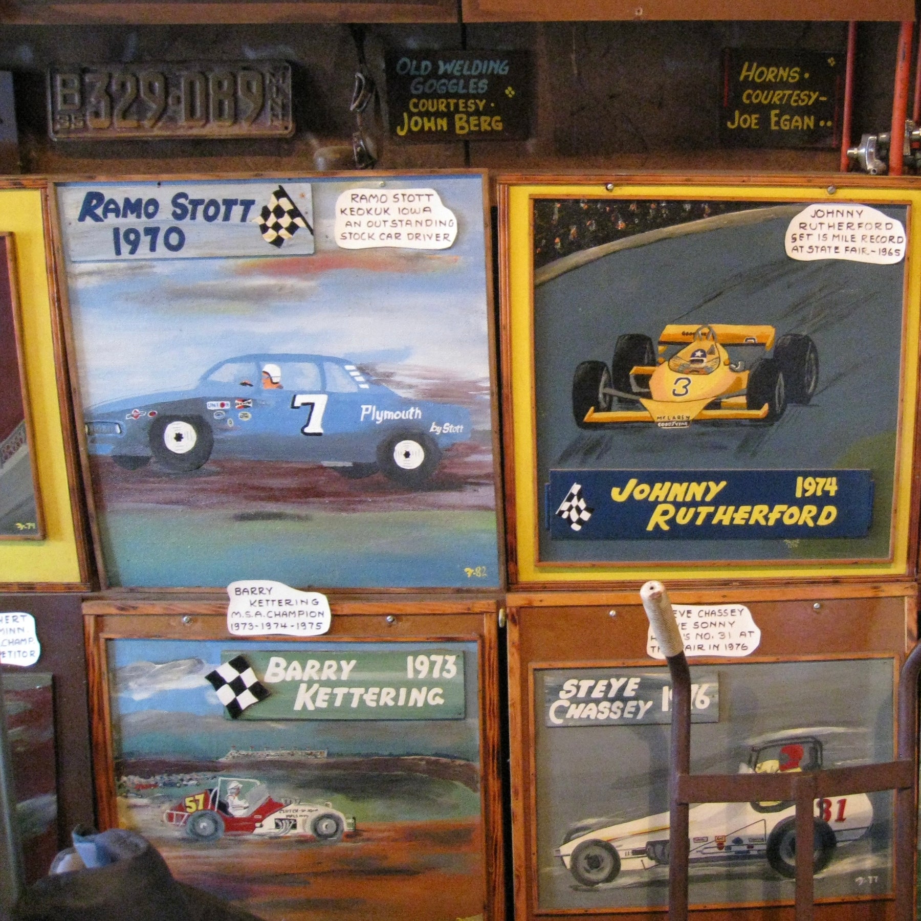 Original race car painting by Gale Frost, who started and ran the Minnesota State Fair History Center, which was originally housed in a couple of vintage passenger train cars at the north end of the fair in Heritage Square before the new History Building was built to house the collection.