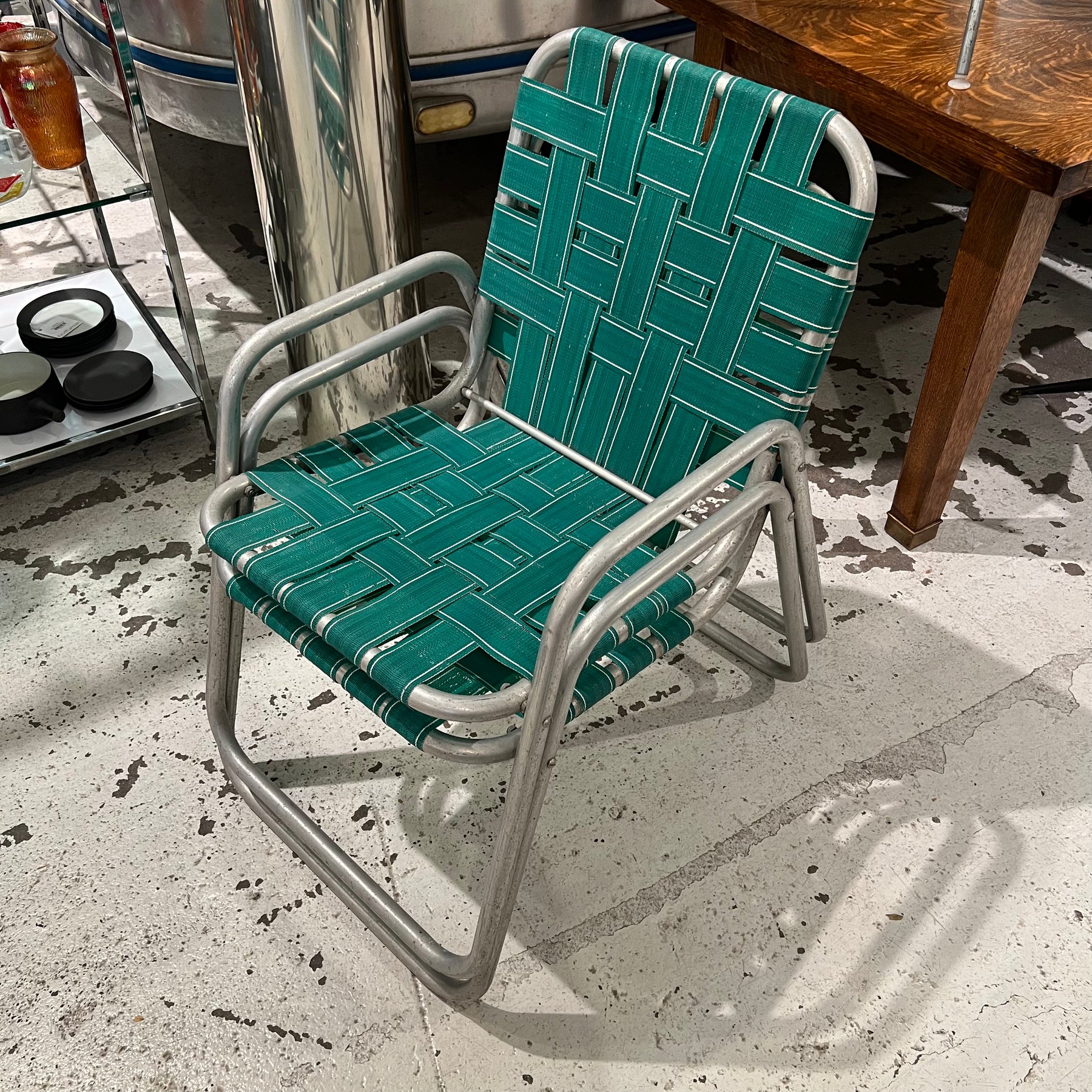 Nice pair of vintage aluminum lawn chairs with green nylon webbing. Stackable, but do not fold.