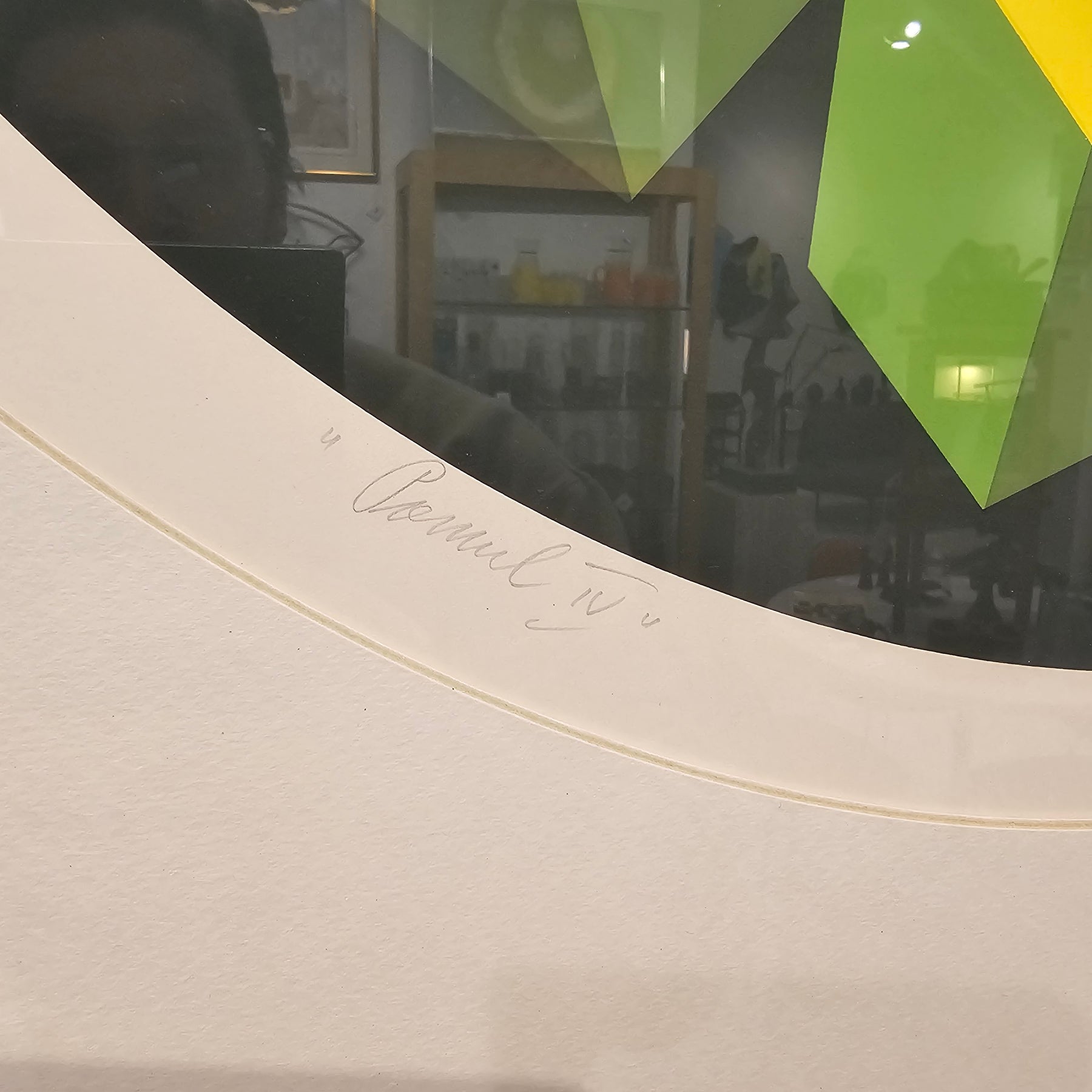 Housed in a custom yellow frame with round matting, this piece amplifies its vivid palette while giving a nod to the artist’s saturated, architectural sensibility. A visually striking addition to any modern or postmodern collection—where color, composition, and control converge.