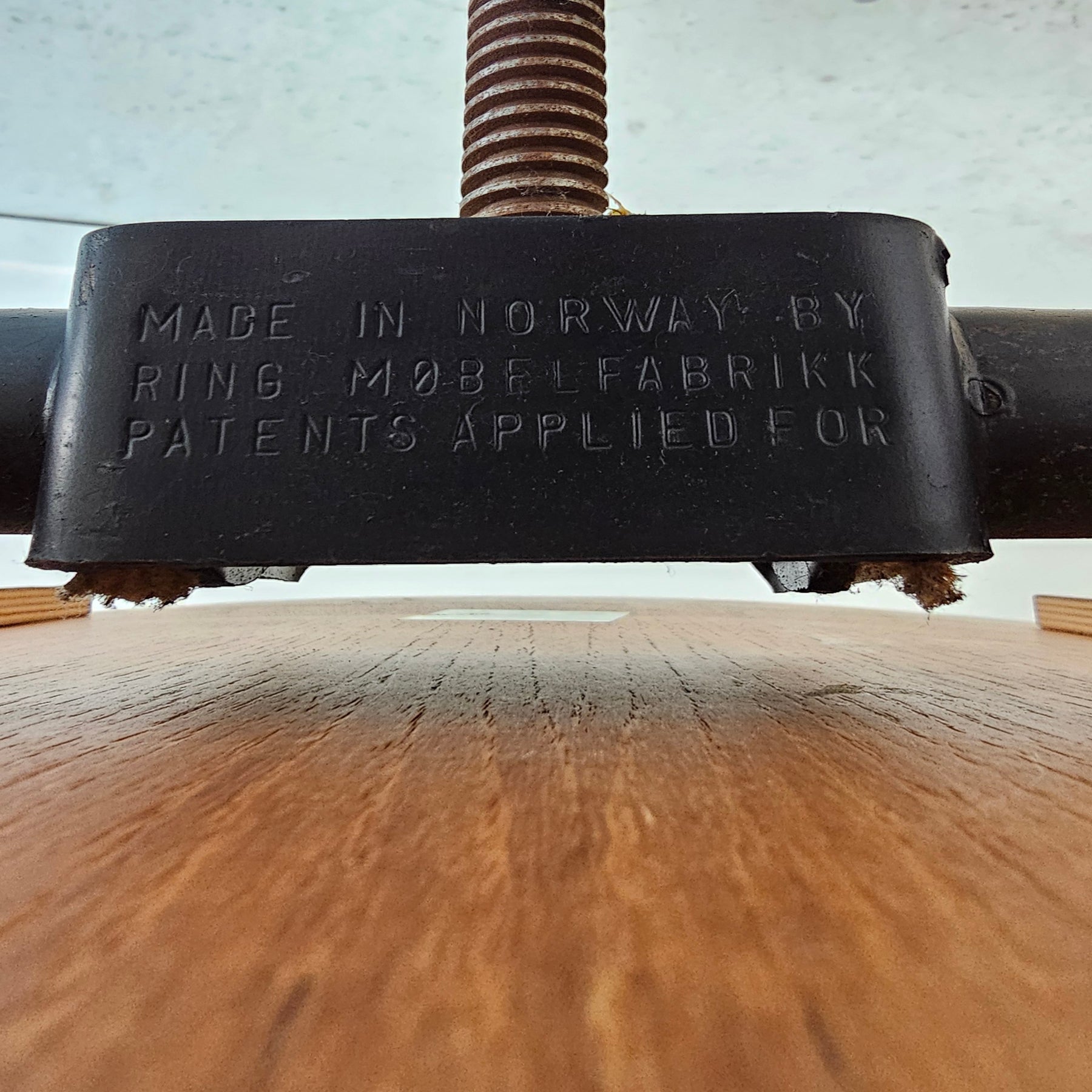 This truly rare executive armchair designed by Jorgen Rasmussen for Kevi features a high back frame made of bent ply on an iron based includes rotary adjustment mechanisms. The base includes original manufacturers stamp. The seat pads attach/detach easily with velcro so can be replaced if desired, though they are still in good condition considering their age. The frame of the chair does show some dings/scratches, primarily to the backrest.