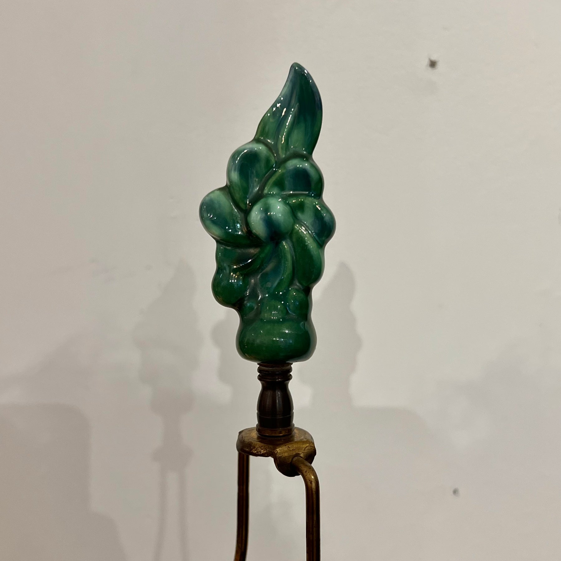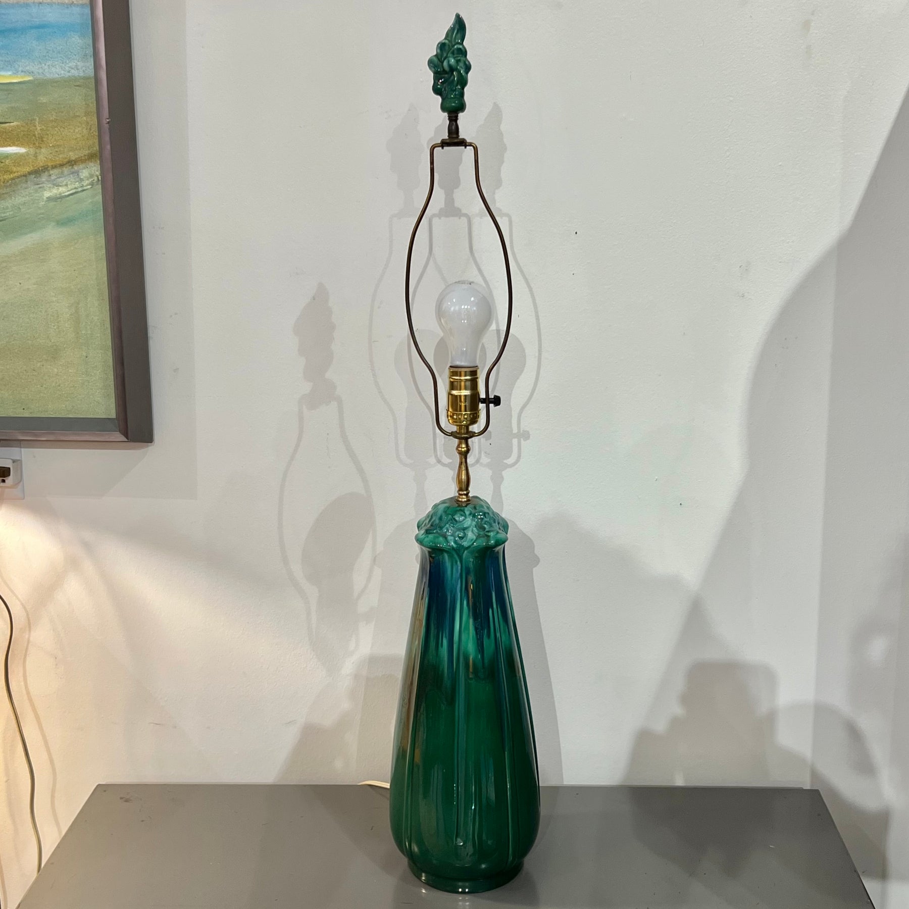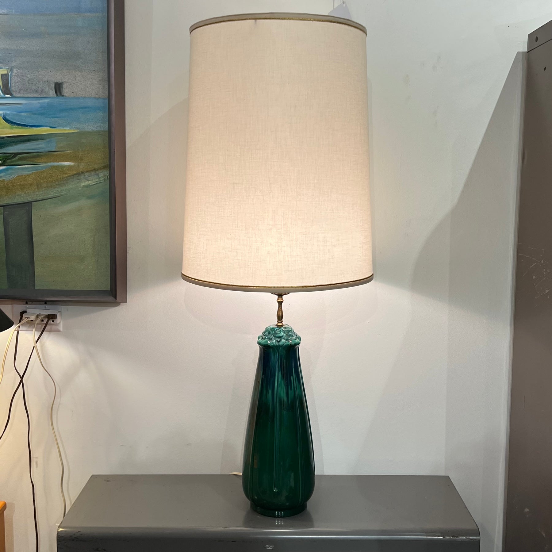 Beautiful vintage ceramic table lamp with a varied blue/green glaze. Finial is glazed ceramic as well. 3-way switch. A couple of minor stains on shade.