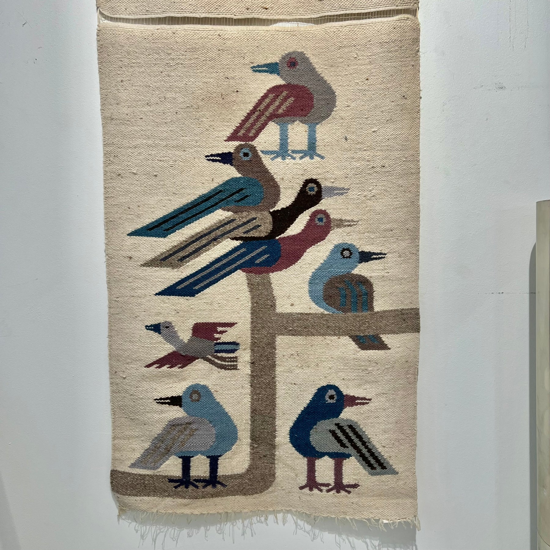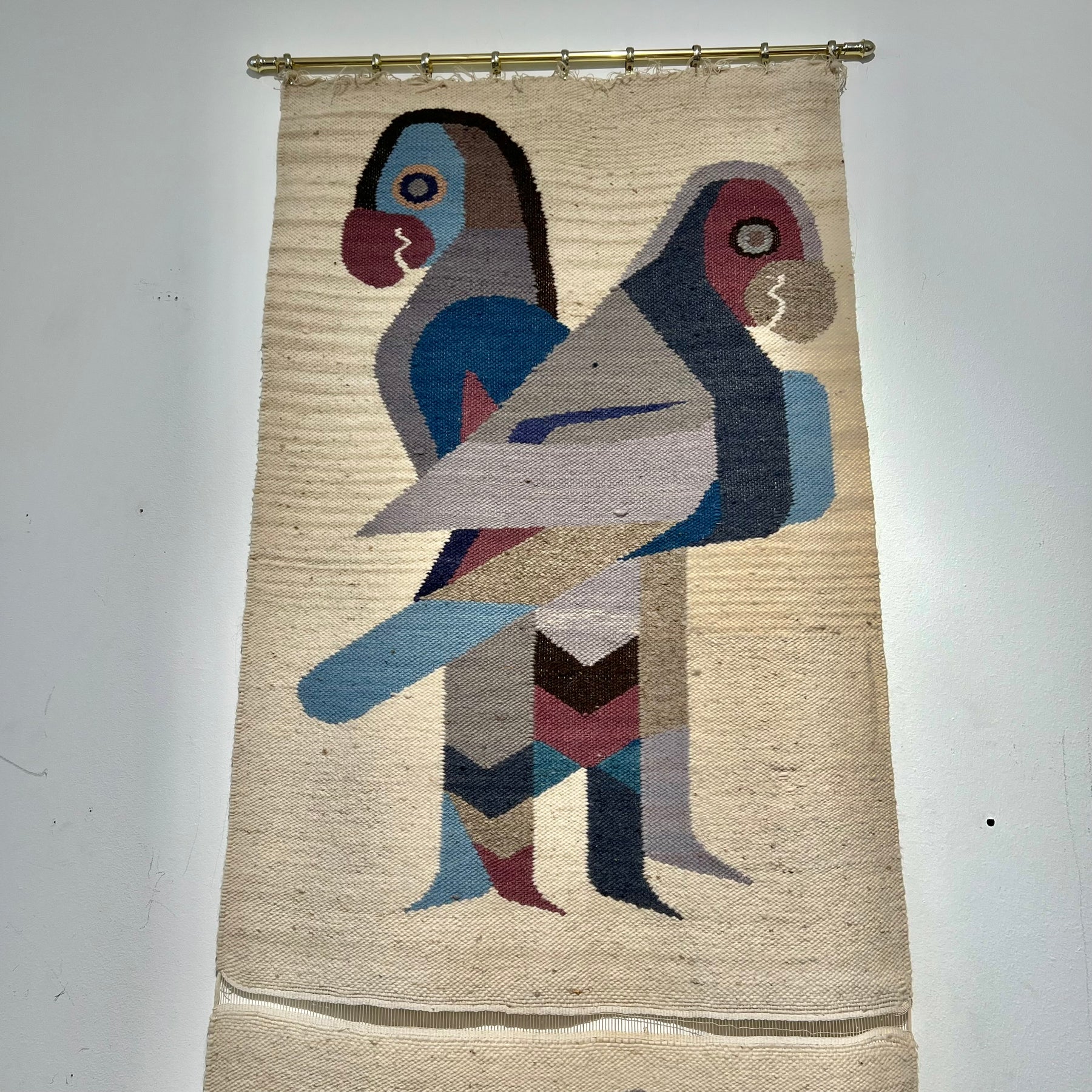 Large contemporary Ecuadorian wool wall tapestry of various birds in a pastel palette. Brass hanging rod.