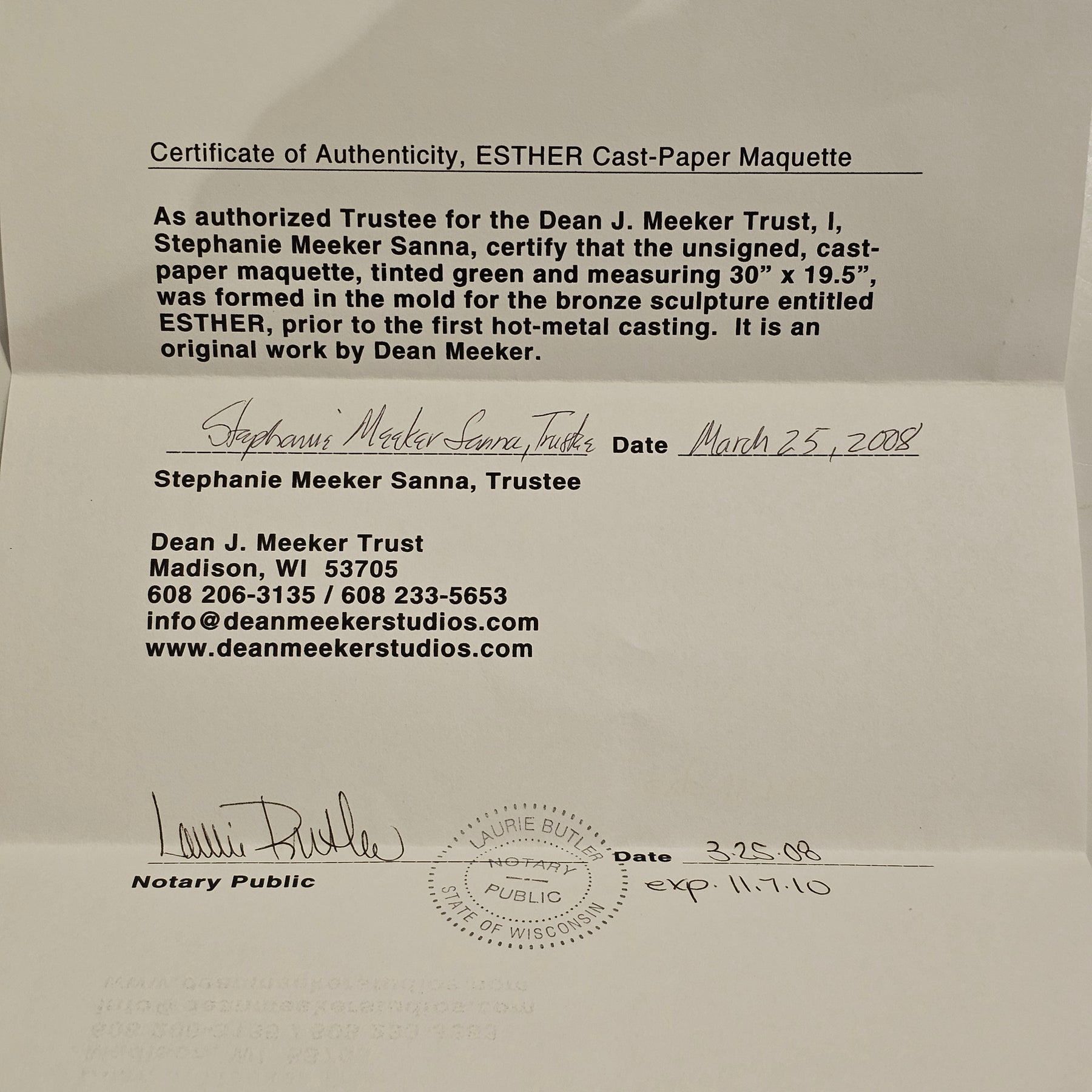 Per Certification of Authenticity: "As authorized Trustee for the Dean J. Meeker Trust, I Stephanie Meeker Santa, certify that the unsigned, cast-paper maquette, tinted green and measuring 30" x 19.5", was formed in the mold for the bronze sculpture entitled ESTHER, prior to the first hot-metal casting.   It is an original work by Dean Meeker"