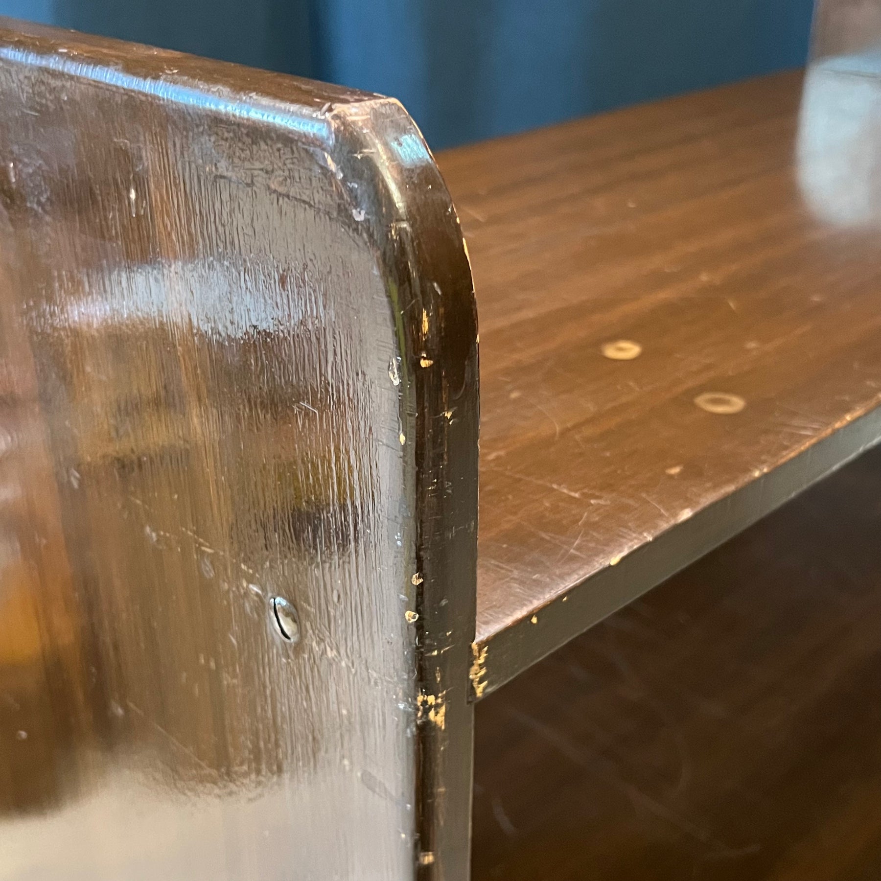 Vintage Gaylord Bros. rolling wood book cart with a dark brown finish. 5” brown rubber casters. Some scratches and wear consistent with age and use.