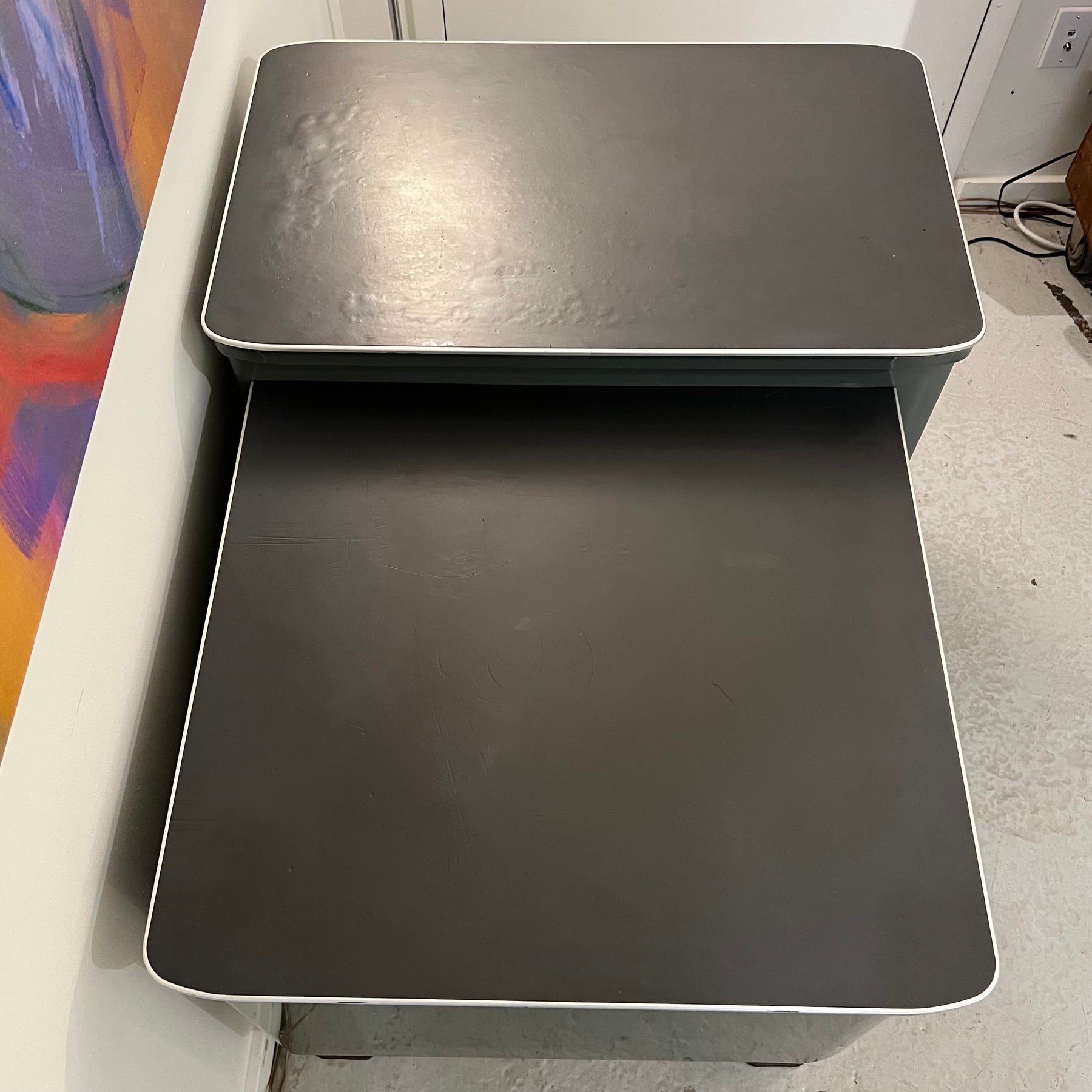 1960s-era General Fireproofing “Generalaire” series single-pedestal metal desk, with a bi-level design used for adding machines. Extremely sturdy and in excellent condition aside from some scratches and wear common to age and use. Freshly cleaned inside and out. Drawers have many different storage configurations, and there is a 12” deep shelf below.