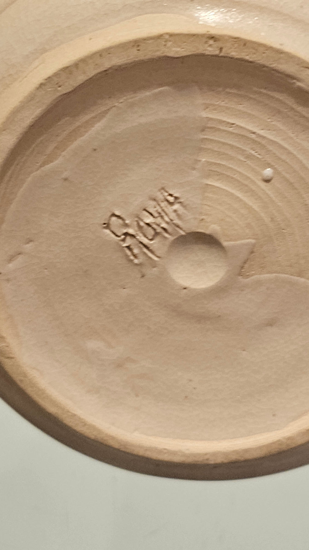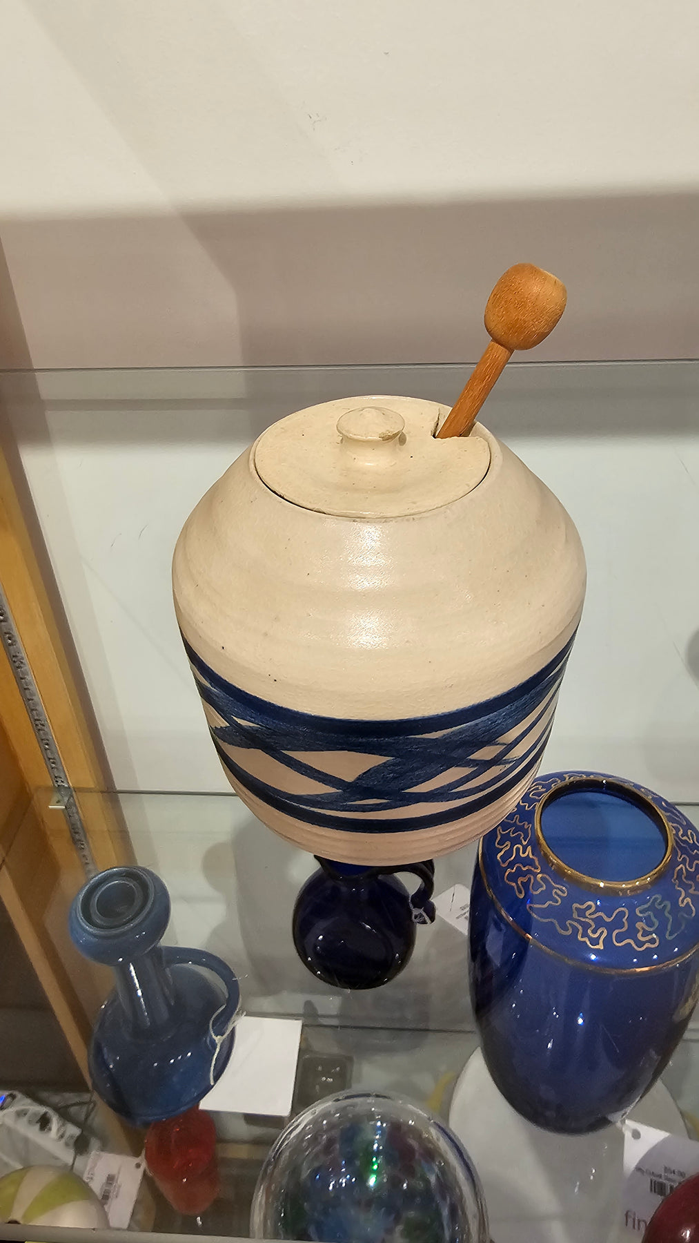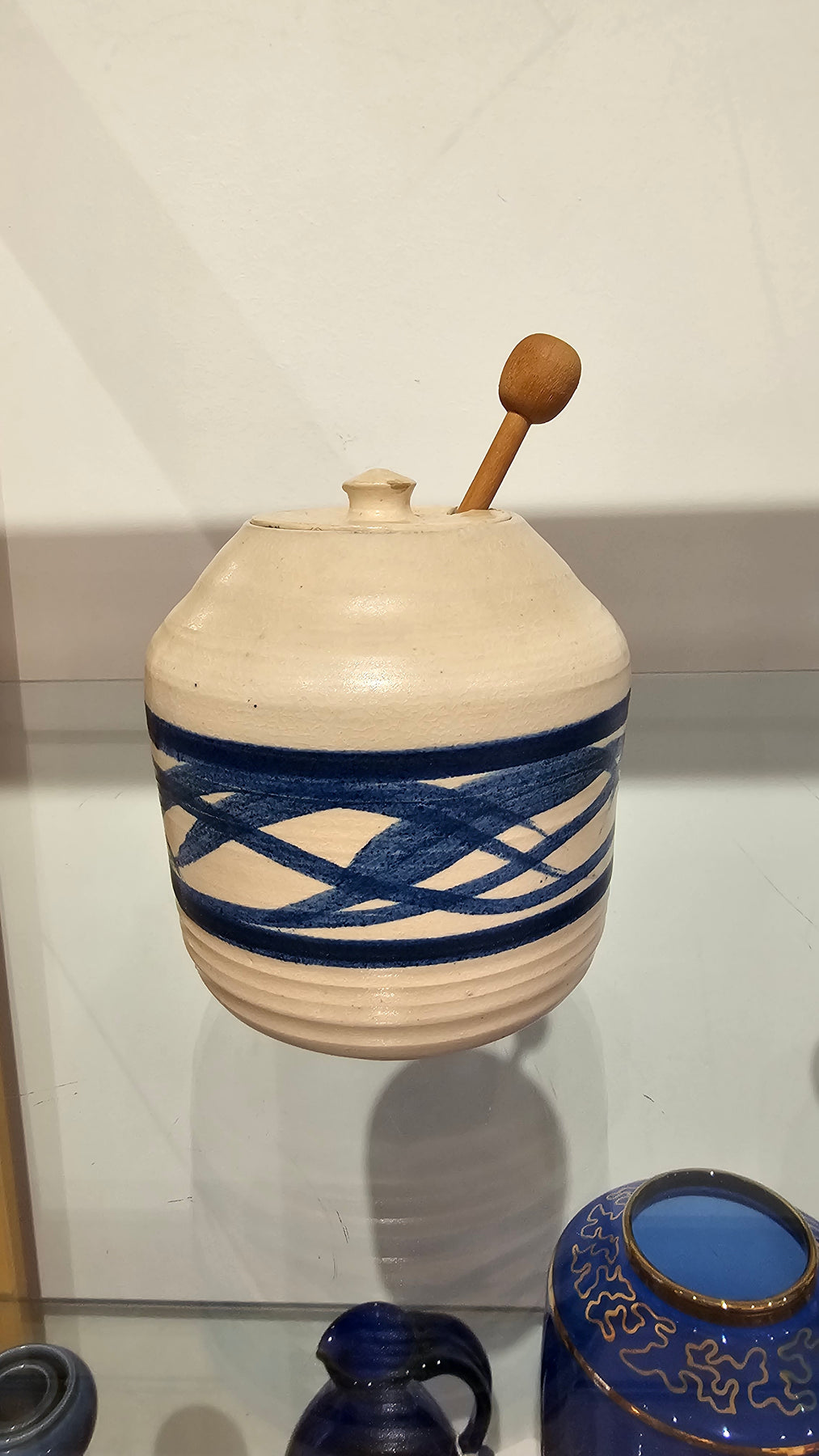 Studio Pottery Honey Pot.   Signed "Roma" on base.   Approximately 5" x 5".  Includes honey wand.