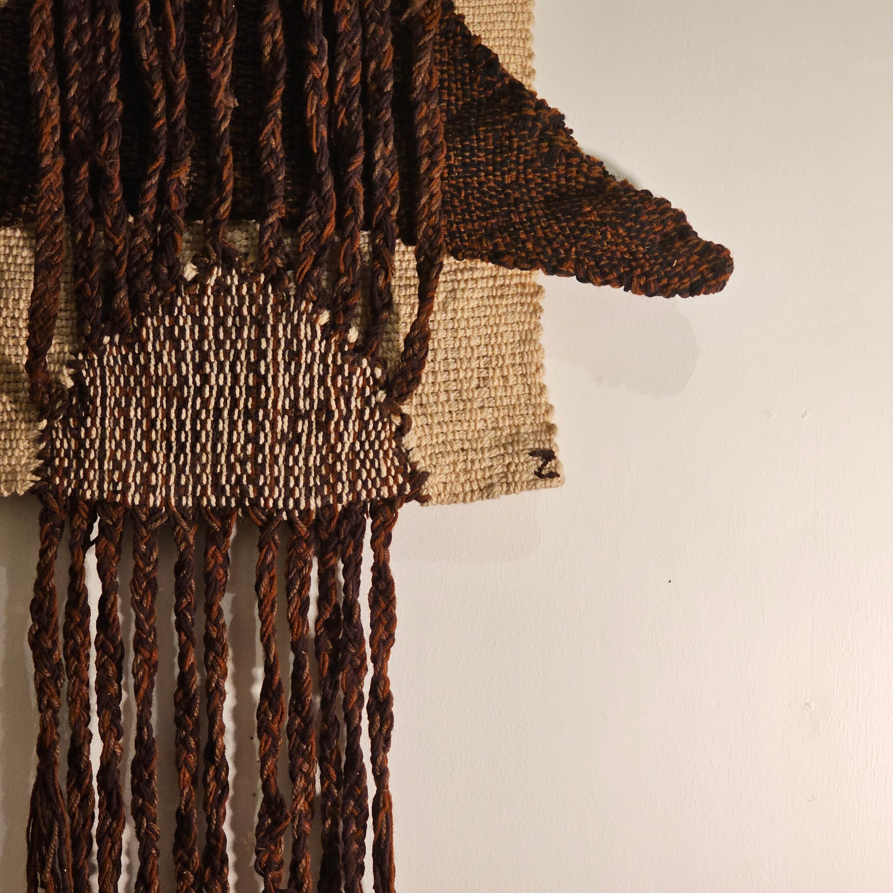 Striking handwoven Japanese wool tapestry, featuring bold geometric and organic forms in natural cream and deep brown tones. Textural braids and fringe add sculpture depth, making it a standout wall piece with both rustic and modernist appeal. Likely mid-20th century, this textile is signed with an initial "Z" in the lower corner.