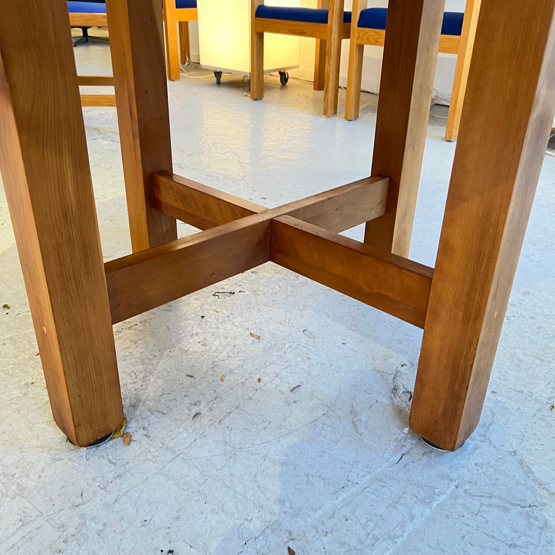 Beautifully designed and proportioned solid wood custom dining table from the 1980s. Top has been refinished. Some scratches and marks around edge of top, and minimal wear to base. The rest of the table has been thoroughly reconditioned. Top the entire table breaks down simply and easily for ease of transport and moving.