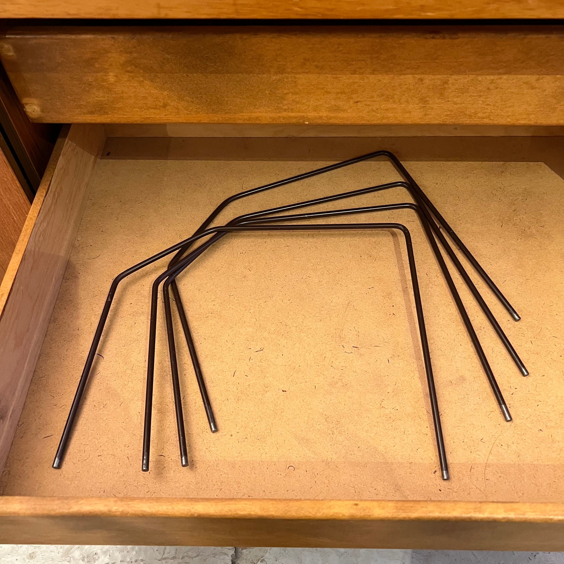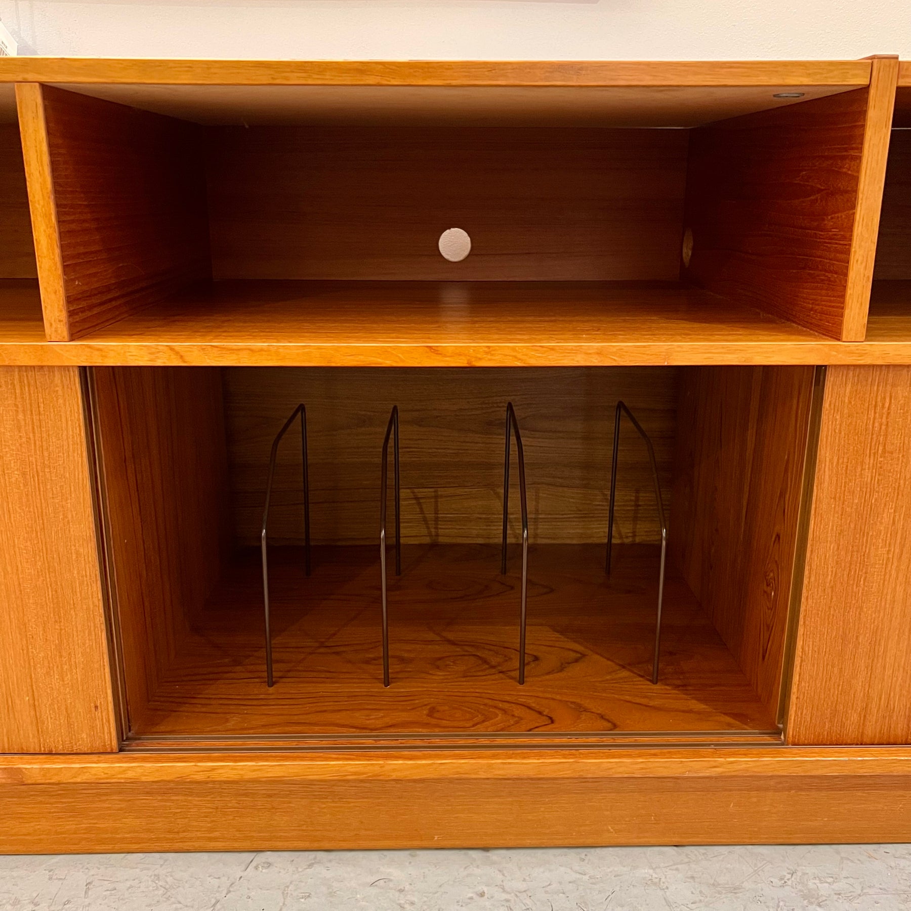 Here it is, the teak entertainment cabinet of your dreams! It is in excellent condition with a freshly-refinished top (though there are a few light scratches still that were too deep to risk sanding through the veneer). Plenty of space for equipment and records. The top on the right side flips up for turntable access. The lower cabinets feature a pullout shelf on the left side, LP storage in the middle with dividers, and two shallow pullout drawers on the right side, which were a custom modification by the previous owner. Originally, the right side was also for LP storage, and the original steel wire dividers are still present, so the drawers could be removed and the dividers re-inserted.