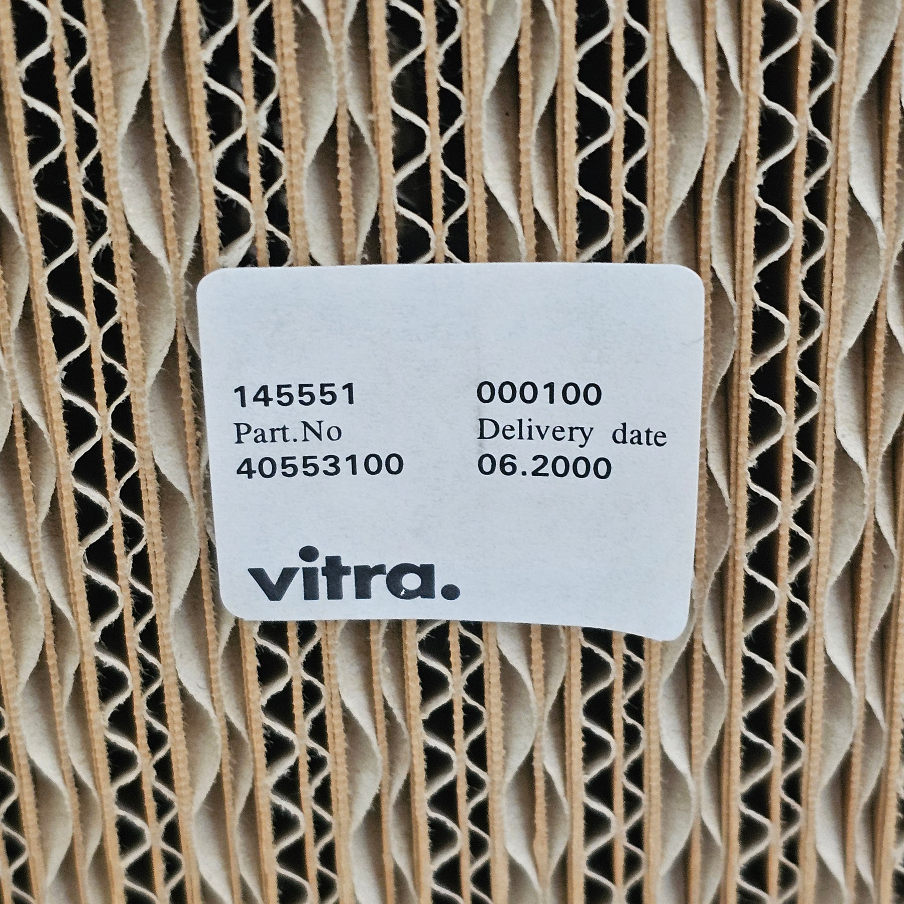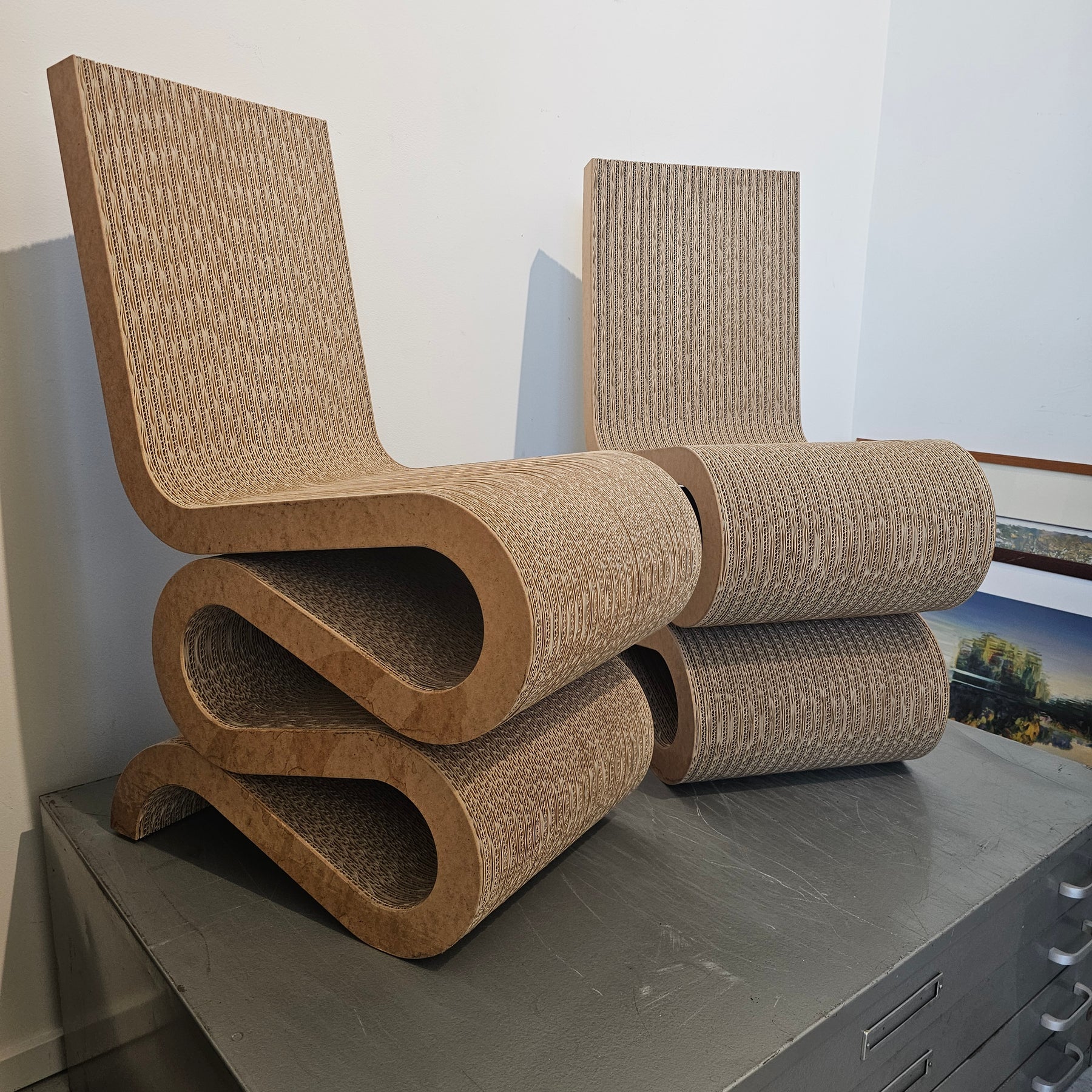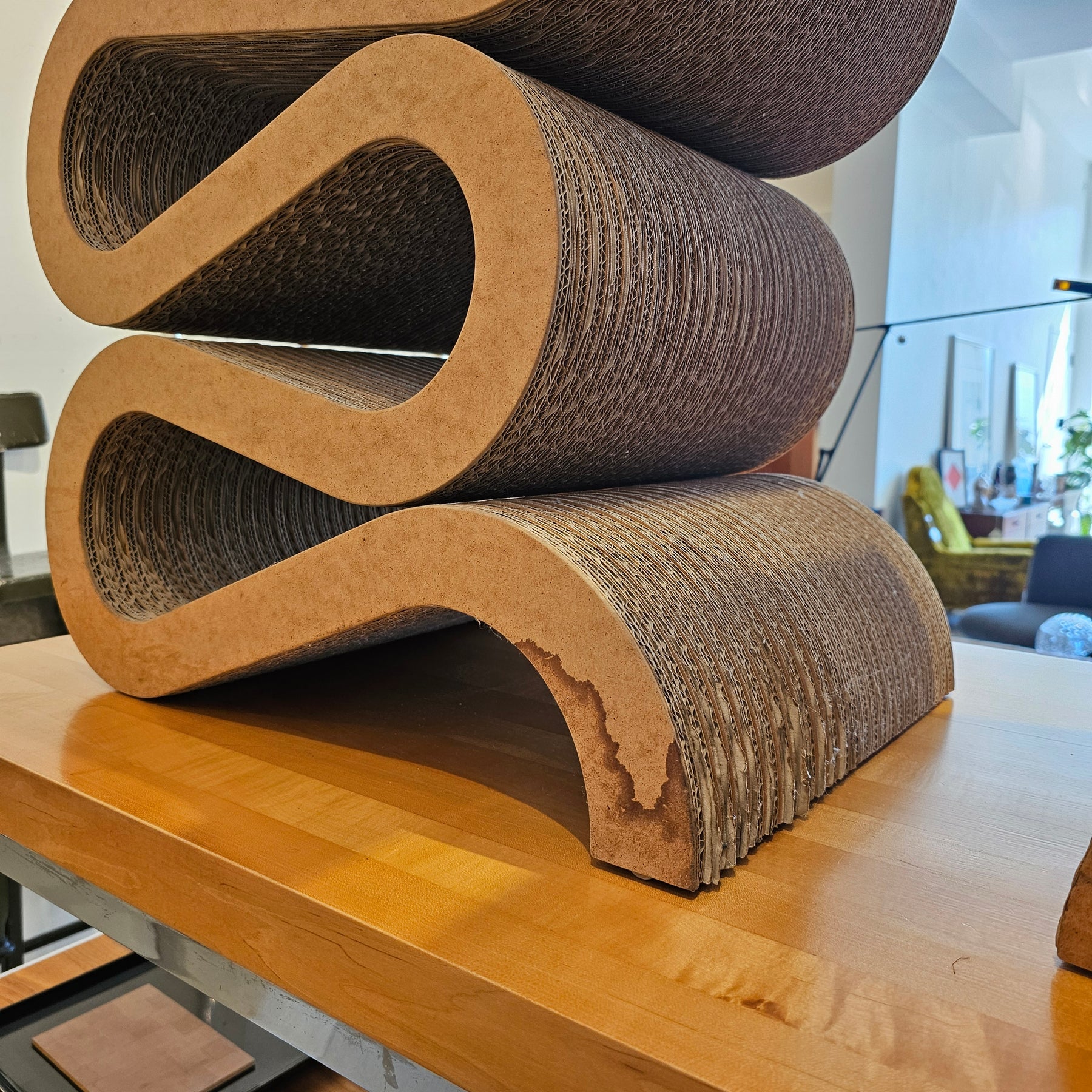 A true design icon, the Wiggle Chair by Frank Gehry blends bold sculptural form with everyday functionality. Crafted from layered cardboard, its striking curves and surprising comfort showcase Gehry's architectural genius. This authentic Vitra piece comes with original tags intact—a perfect addition for collectors or lovers of modern design. Each chair shows some discoloration to base on one side, but this does not affect structural integrity of either piece. Two available at the time of this listing going up, priced individually.
