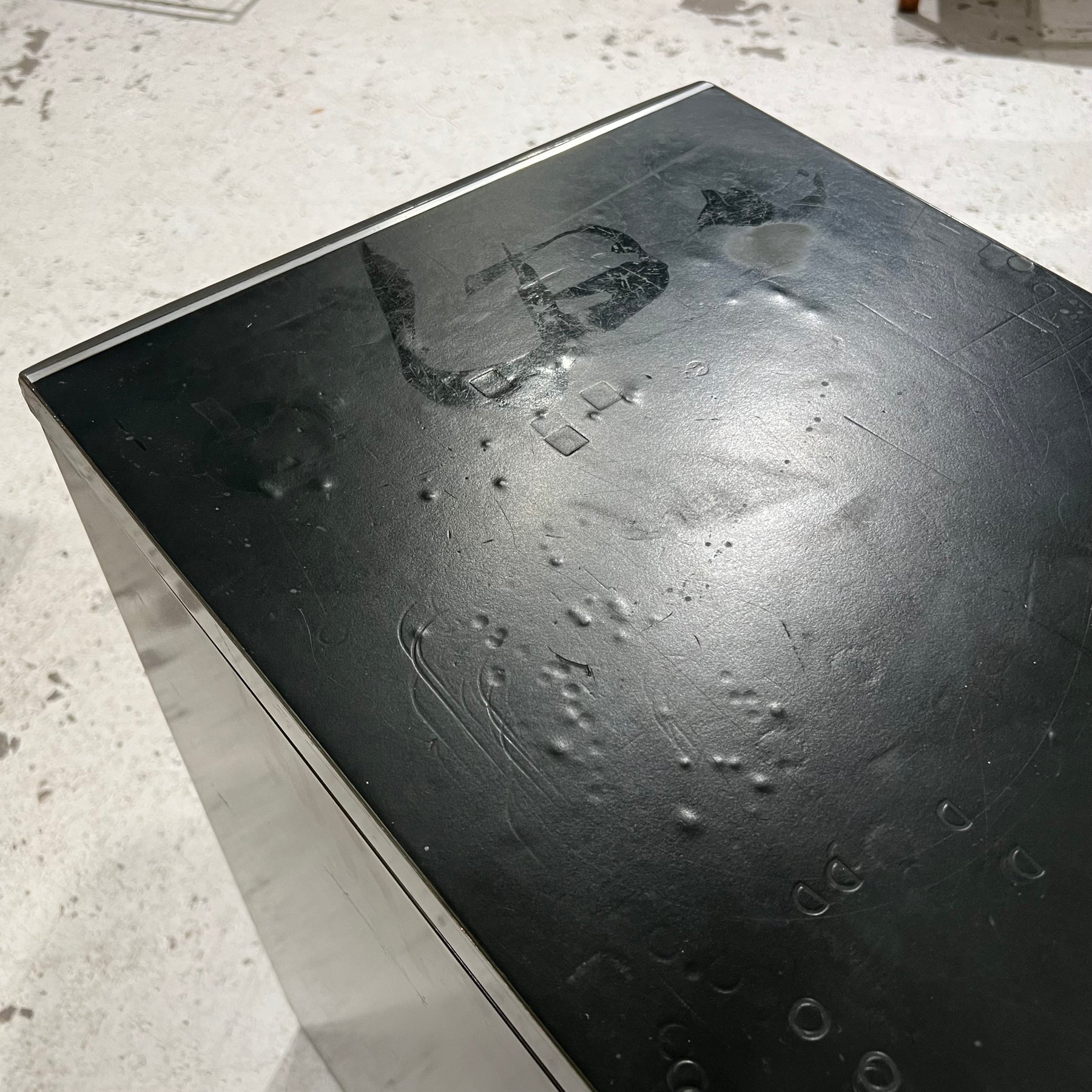 1960s-era General Fireproofing “Superfiler” 2-drawer locking file cabinet. It is painted its original dark military green and has a dark greenish black linoleum top with aluminum edging and a gray plastic curved bumper front and back. Brushed aluminum hardware. The front of each drawer tilts outward when open for ease of filing, and each has several adjustable dividers. Lock works and has key. The linoleum top has a patina of small marks, impressions and other wear, but otherwise clean. Some scratches and wear common to age and use. One of the best-designed file cabinets ever built!