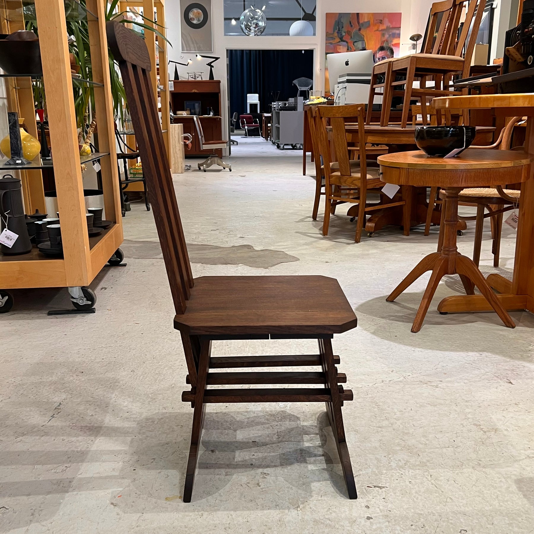 Rare 1920s Stickley solid oak hall chair with a very modern design, refurbished in its original finish. Dimensions: 16.5” w, 20” d, 40.75” h, 16.75” h seat. Seat is 16” square. Functional oak mortise pins hold the three stabilizing slats underneath firmly.