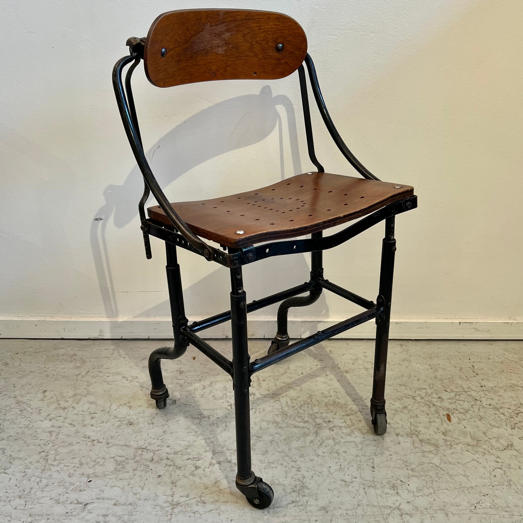 Very excited about this rare early DoMore industrial work chair circa early 1920s. It features a steel frame in its original black paint and a plywood seat and back. Despite having a nice patina associated with its age and use, it is in exceptional condition for being over a century old. Rarer still is the pattern of holes drilled into the seat forming a square with the letter D (for DoMore) within. The original paper tag is still affixed to the bottom and mostly intact. There is a small brass inventory tag affixed to the back of the backrest. The chair is also adjustable. The backrest can be lowered and set back by positioning the bolts along the side of the seat that hold the back supports, and the height of the seat can be adjusted every inch by resetting the bolts in the four posts under the chair that connect to the legs.