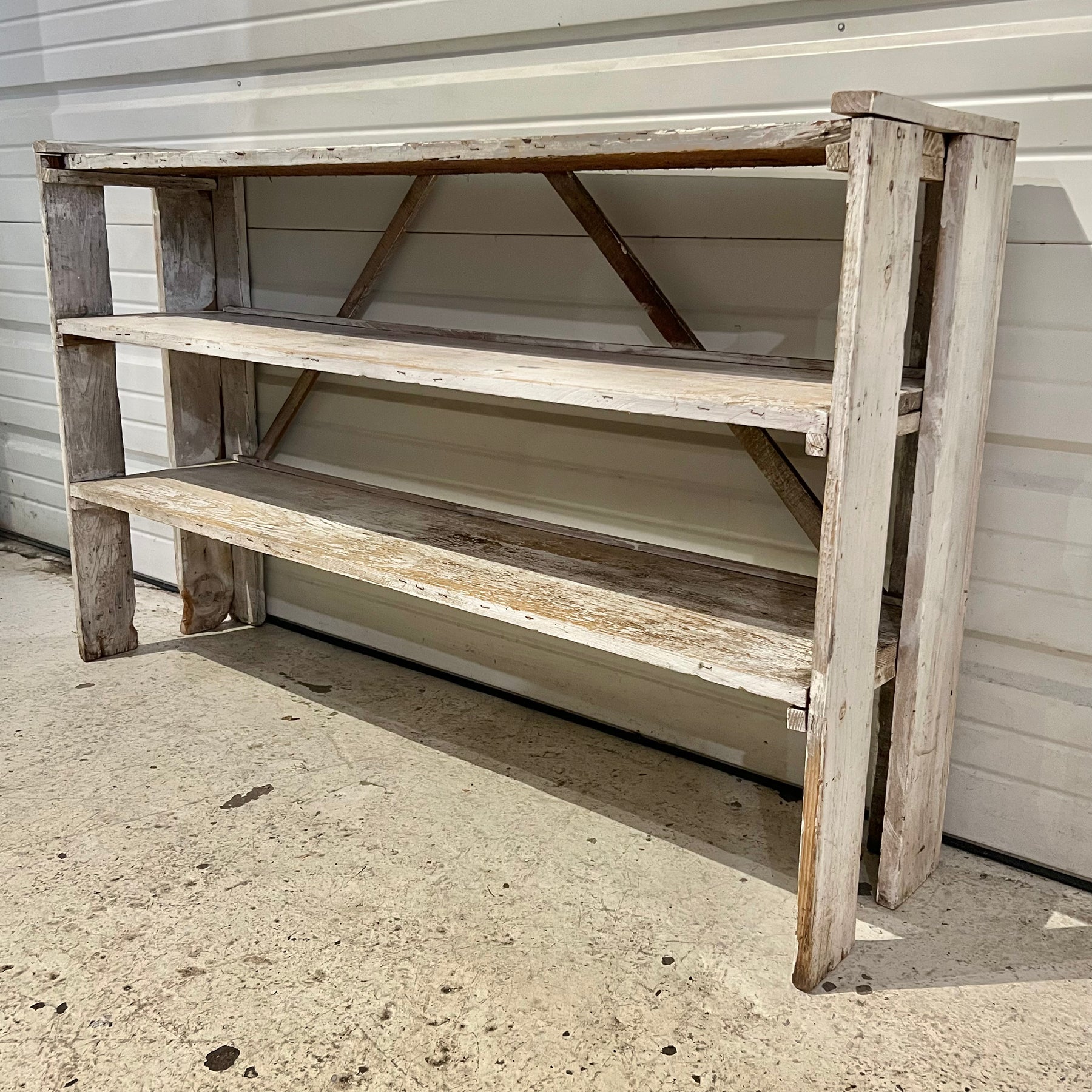 Great set of homemade wooden garage/workshop shelves, painted white. Well-worn to a nice patina. Great for use as a small bookcase.